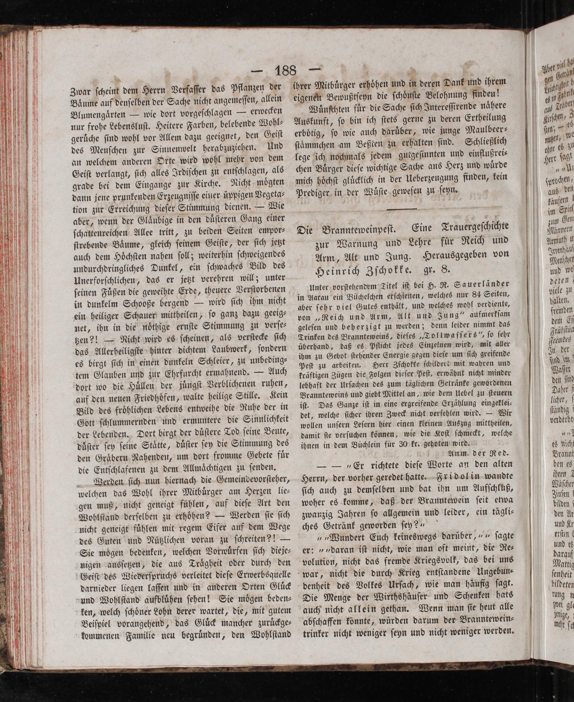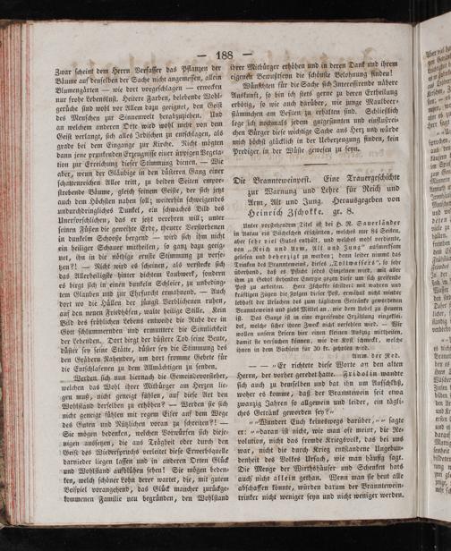 Unter vorſtehendem Titel iſt bei H. R. Sauerländer in Aarau ein Büchelchen erſchienen, welches nur 84 Seiten, aber ſehr viel Gutes enthält, und welches wohl verdiente, von„Reich und Arm, Alt und Jung“ aufmerkſam geleſen und beherzigt zu werden; denn leider nimmt das Trinken des Brannteweins, dieſes„Tollwaſſers“, ſo ſehr überhand, daß es Pflicht jedes Einzelnen wird, mit aller ihm zu Gebot ſtehender Energie gegen dieſe um ſich greifende peſt zu arbeiten. Herr Zſchokke ſchildert mit wahren und kräftigen Zügen die Folgen dieſer Peſt, erwähnt nicht minder lebhaft der Urſachen des zum täglichen Getränke gewordenen Brannteweins und giebt Mittel an, wie dem Uebel zu ſteuern iſt. Das Ganze iſt in eine ergreifende Erzählung eingeklei⸗ det, welche ſicher ihren Zweck nicht verfehlen wird.— Wir wollen unſern Leſern hier einen kleinen Auszug mittheilen, damit ſte verſuchen können, wie die Koſt ſchmeckt, welche ihnen in dem Büchlein für 30 kr. geboten wird.