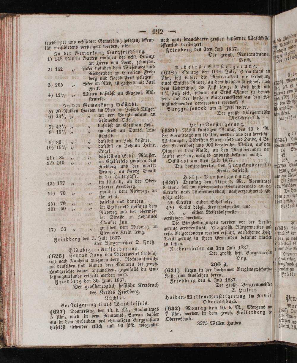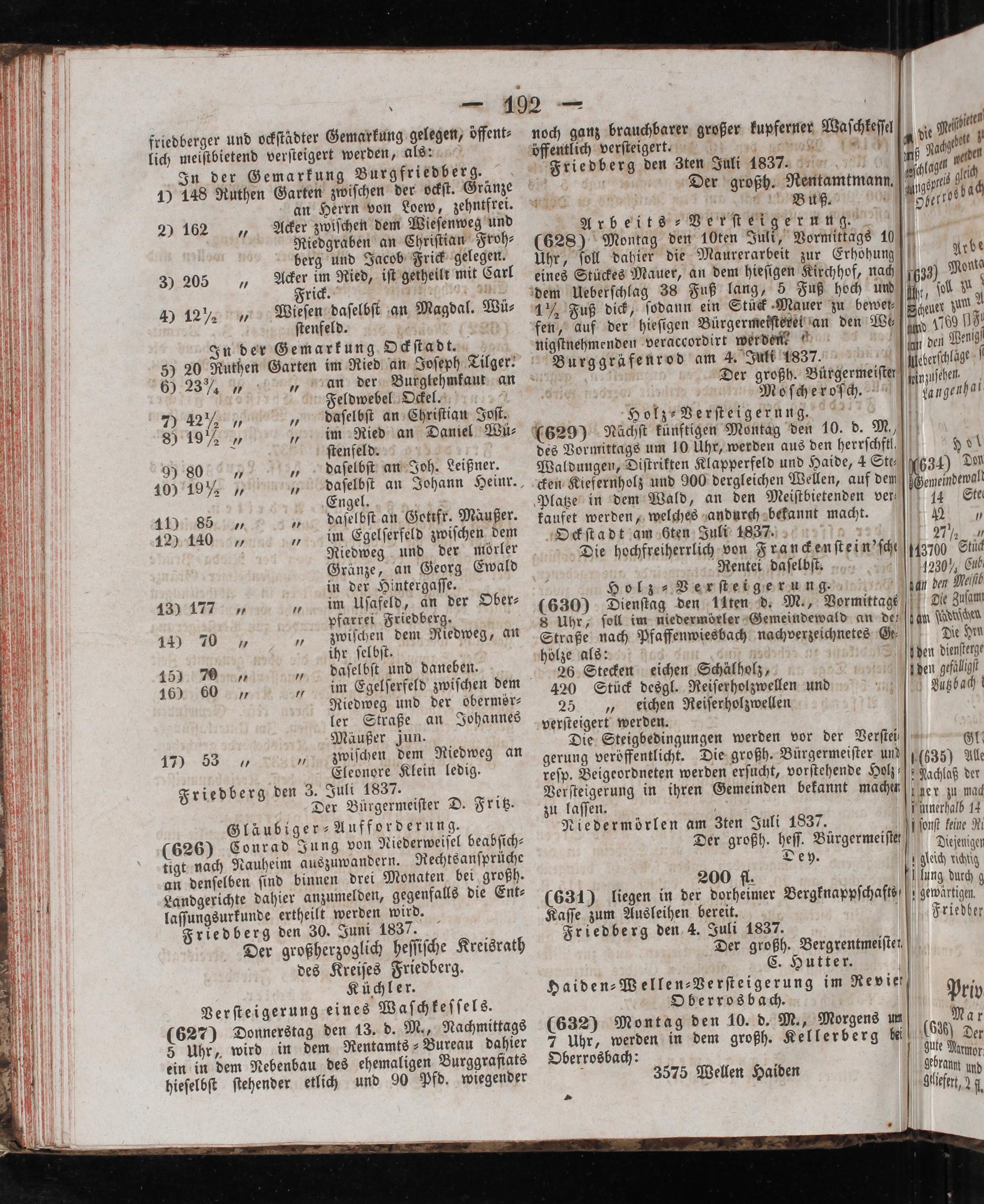 Eleonore Klein ledig. Friedberg den 3. Juli 1837. Der Bürgermeiſter D. Fritz. Gläubiger⸗ Aufforderung. (626) Conrad Jung von Niederweiſel beabſich⸗ tigt nach Nauheim auszuwandern. Rechtsanſprüche an denſelben ſind binnen drei Monaten bei großh. Landgerichte dahier anzumelden, gegenfalls die Ent⸗ laſſungsurkunde ertheilt werden wird. Friedberg den 30. Juni 1837. Der großherzoglich heſſiſche Kreisrath des Kreiſes Friedberg. Küchler. Verſteigerung eines Waſchkeſſels. (627) Donnerstag den 13. d. M., Nachmittags 5 Uhr, wird in dem Rentamts⸗ Bureau dahier ein in dem Nebenbau des ehemaligen Burggrafiats hieſelbſt ſtehender etlich und 90 Pfd. wiegender