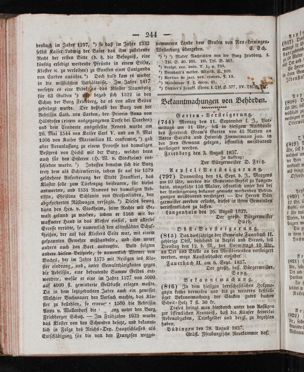 Garten ⸗Verſteigerung. (714) Montag den 11. September l. J., Vor⸗ mittags um 11 Uhr, ſoll in hieſigem Rathhauſe des Friedrich Gram's Garten von 45 Ruthen an Anton Surada und Heinrich Zimmermann jun. in der Zten Gewann gelegen, öffentlich meiſtbietend verſteigert werden. Friedberg den 3. Auguſt 1837. In Auftrag: Der Bürgermeiſter D. Fritz. Aepfel: Verſteigerung. (797) Donnerſtag den 14. Sept. d. J., Morgens um 10 Uhr, werden die Gemeinde⸗Aepfek zu Langen⸗ hain, ohngefähr 150 Malter, öffentlich unter den bei der Verſteigerung bekannt gemacht werdenden Bedin⸗ gungen meistbietend verſteigert.— Die Herren Bür⸗ germeiſter werden erſucht, dieſes in ihren Gemeinden veröffentlichen zu laſſen. i Langenhain den 26. Auguſt 1837. 8 Der großh. Bürgermeiſter a Huth.*