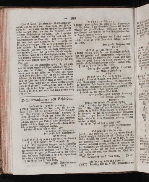 Friedberg den 29ten Mai 1837. 5 Der großherzoglich heſſiſche Kreisrath des Kreiſes Friedberg. Küchler. Gläubiger⸗Aufforderung. (484) Konrad Dewitz von Rendel beabſichtigt nach Kilianſtaͤden auszuwandern. Rechtsanſpruͤche an denſelben ſind binnen drei Monaten bei großh. Landgericht Großkarben anzumelden, gegenfalls die Entlaſſungsurkunde ertheilt werden wird. Friedberg den 25ſten Mai 1837. Der großherzoglich heſſiſche Kreisrath des Kreiſes Friedberg Küchler. Pflaſtererarbeit-Verſteigerung. (485) Dienſtag den 13ten Juni d. J., Vormit⸗ tags 10 Uhr, ſollen auf dem Rathhauſe dahier un⸗ gefaͤhr 20(1 Klafter Gaſſenpflaſter, in hieſigem Orte zu fertigen, an den Wenigſtnehmenden verſteigert werden.— Die Herren Buͤrgermeiſter werden er⸗ ſucht, dieſes in ihren Gemeinden gehoͤrig bekannt machen zu laſſen.—