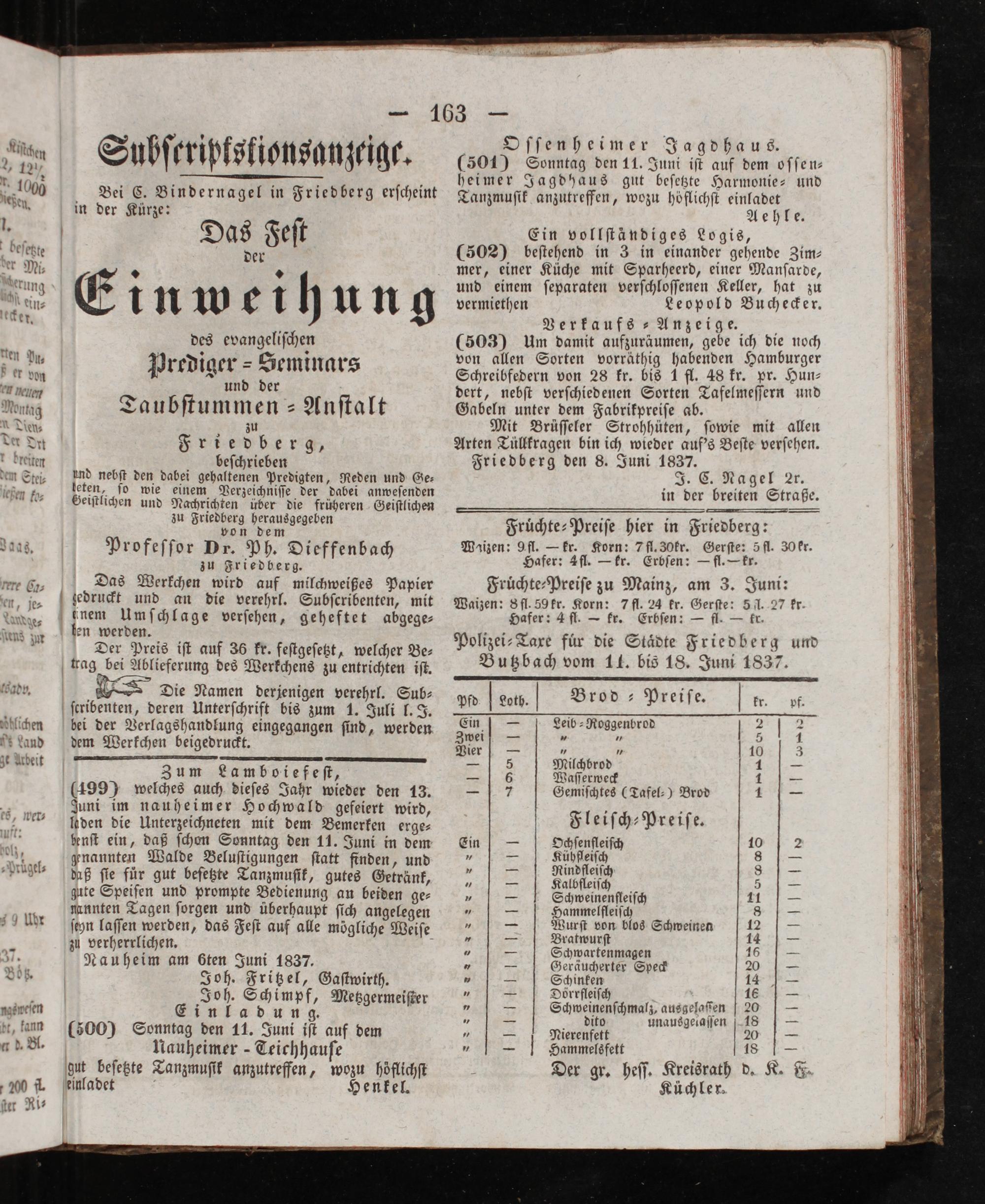 Aehle. Ein vollſtändiges Logis, (502) beſtehend in 3 in einander gehende Zim— mer, einer Küche mit Sparheerd, einer Manſarde, und einem ſeparaten verſchloſſenen Keller, hat zu vermiethen Leopold Buchecker. Verkaufs ⸗ Anzeige. (503) Um damit aufzuräumen, gebe ich die noch von allen Sorten vorräthig habenden Hamburger Schreibfedern von 28 kr. bis 1 fl. 48 kr. pr. Hun⸗ dert, nebſt verſchiedenen Sorten Tafelmeſſern und Gabeln unter dem Fabrikpreiſe ab. Mit Brüſſeler Strohhüten, ſowie mit allen Arten Tüllkragen bin ich wieder auf's Beſte verſehen. Friedberg den 8. Juni 1837. J. C. Nagel r. in der breiten Straße.