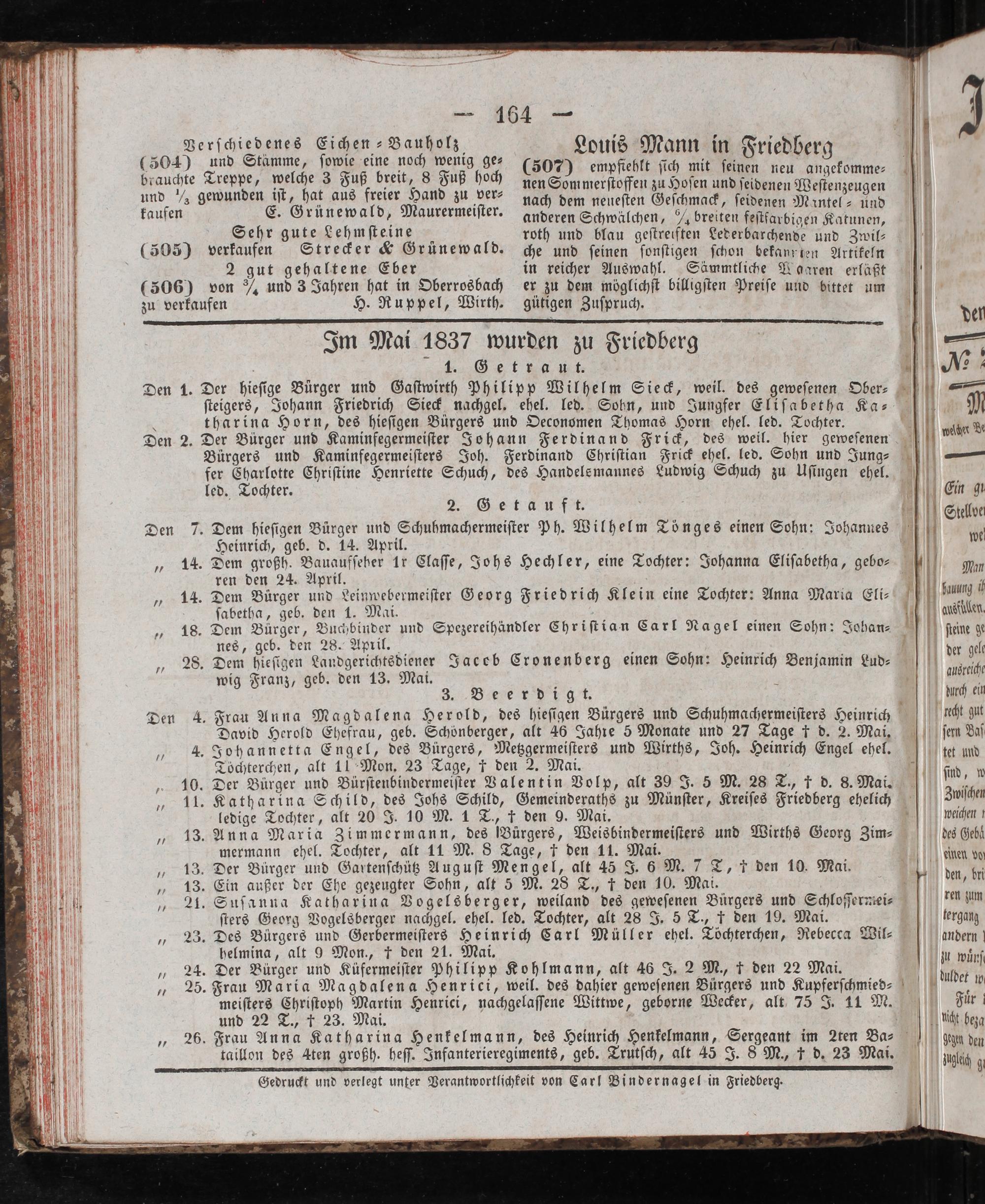 Gedruckt und verlegt unter Verantwortlichkeit von Carl Bindernagel in Friedberg.