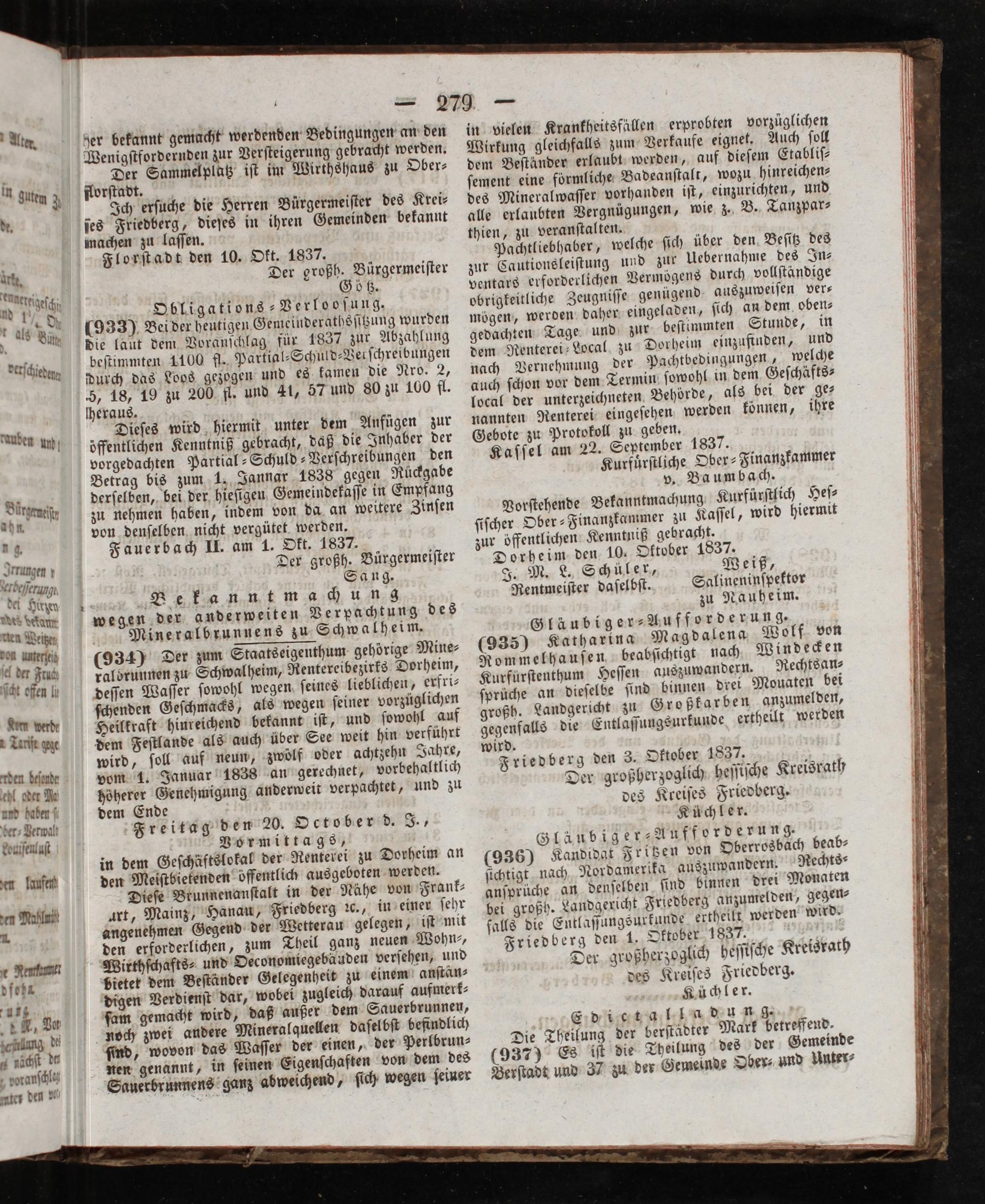 ger bekannt gemacht werdenden Bedingungen an den Wenigſtfordernden zur Verſteigerung gebracht werden. Der Sammelplatz iſt im Wirthshaus zu Ober⸗ florſtadt. 2 erſuche die Herren Bürgermeiſter des Krei⸗ ſes Friedberg, dieſes in ihren Gemeinden bekannt machen zu laſſen. Florſtadt den 10. Okt. 1837. Der großh. Bürgermeiſter Götz. Obligations⸗Verlooſung. 1933) Bei der heutigen Gemeinderathsſitzung wurden die laut dem Voranſchlag für 1837 zur Abzahlung beſtimmten 1100 fl. Partial⸗Schuld⸗Verſchreibungen durch das Loos gezogen und es kamen die Nro. 2, 5, 18, 19 zu 200 fl. und Kt, 57 und 80 zu 100 fl. lheraus. l Dieſes wird hiermit unter dem Anfügen zur öffentlichen Kenntniß gebracht, daß die Inhaber der vorgedachten Partial-Schuld⸗Verſchreibungen den Betrag bis zum 1. Jannar 1838 gegen Rückgabe derſelben, bei der hieſigen Gemeindekaſſe in Empfang zu nehmen haben, indem von da an weitere Zinſen von denſelben nicht vergütet werden. Fauerbach II. am 1. Okt. 1837. Der großh. Bürgermeiſter Sang. Bekanntmachung wegen der anderweiten Verpachtung des Mineralbrunnens zu Schwalheim. (934) Der zum Staatseigenthum gehörige Mine⸗ ralorunnen zu Schwalheim, Rentereibezirks Dorheim, deſſen Waſſer ſowohl wegen ſeines lieblichen, erfri⸗ ſchenden Geſchmacks, als wegen ſeiner vorzüglichen Heilkraft hinreichend bekannt iſt, und ſowohl auf dem Feſtlande als auch über See weit hin verführt wird, ſoll auf neun, zwölf oder achtzehn Jahre, vom 1. Januar 1838 an gerechnet, vorbehaltlich höherer Genehmigung anderweit verpachtet, und zu
