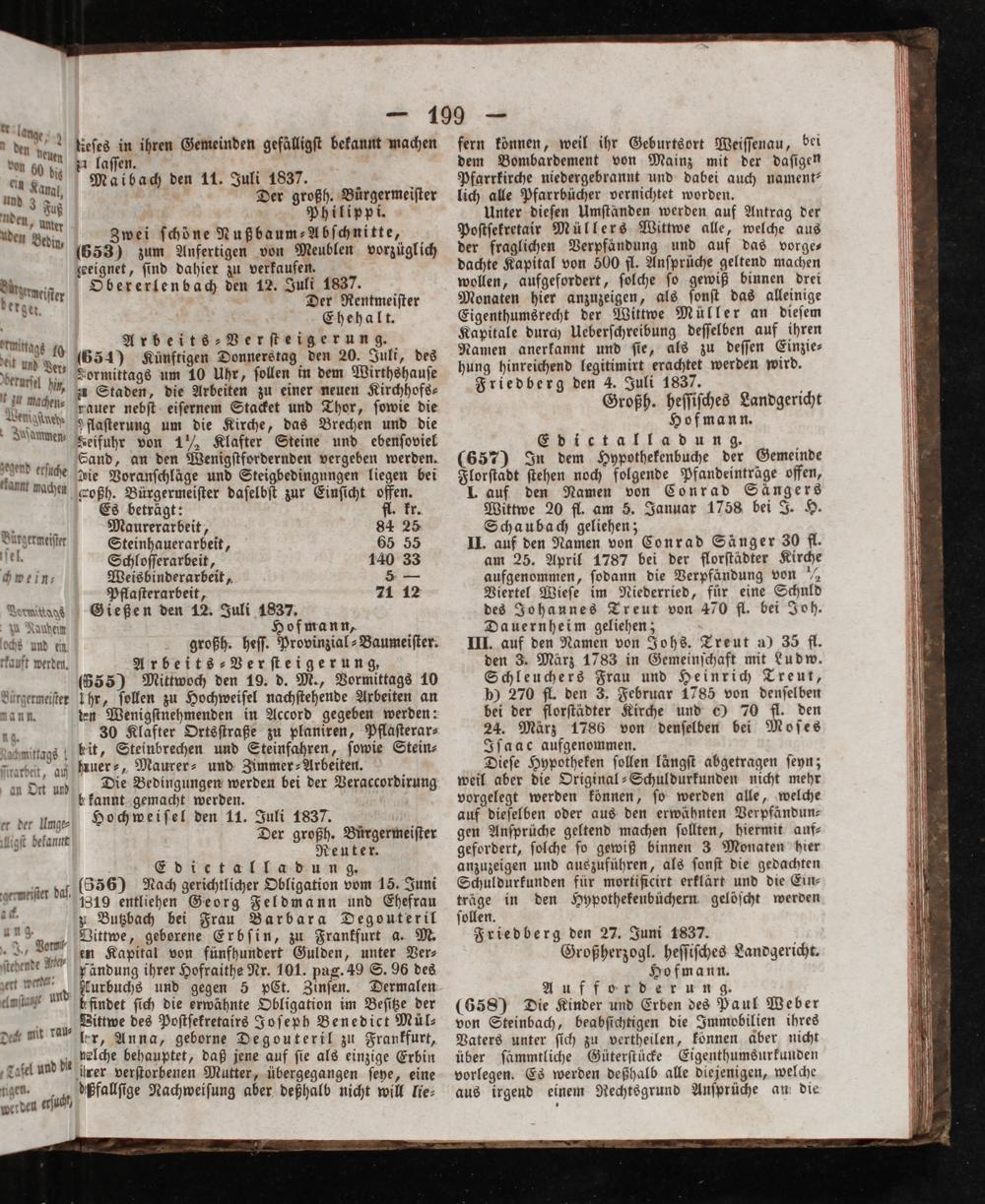 großh. heſſ. Provinzial⸗Baumeiſter. Arbeits⸗Verſteigerung, (655) Mittwoch den 19. d. M., Vormittags 10 Uhr, ſollen zu Hochweifel nachſtehende Arbeiten an ten Wenigſtnehmenden in Accord gegeben werden: 30 Klafter Ortsſtraße zu planiren, Pflaſterar⸗ bit, Steinbrechen und Steinfahren, ſowie Stein⸗ uer⸗, Maurer⸗ und Zimmer ⸗Arbeiten. Die Bedingungen werden bei der Veraccordirung b kannt gemacht werden. Hochweiſel den 11. Juli 1837. Der großh. Bürgermeiſter Reuter. b Edietalla dung. (856) Nach gerichtlicher Obligation vom 15. Juni 1819 entliehen Georg Feldmann und Ehefrau