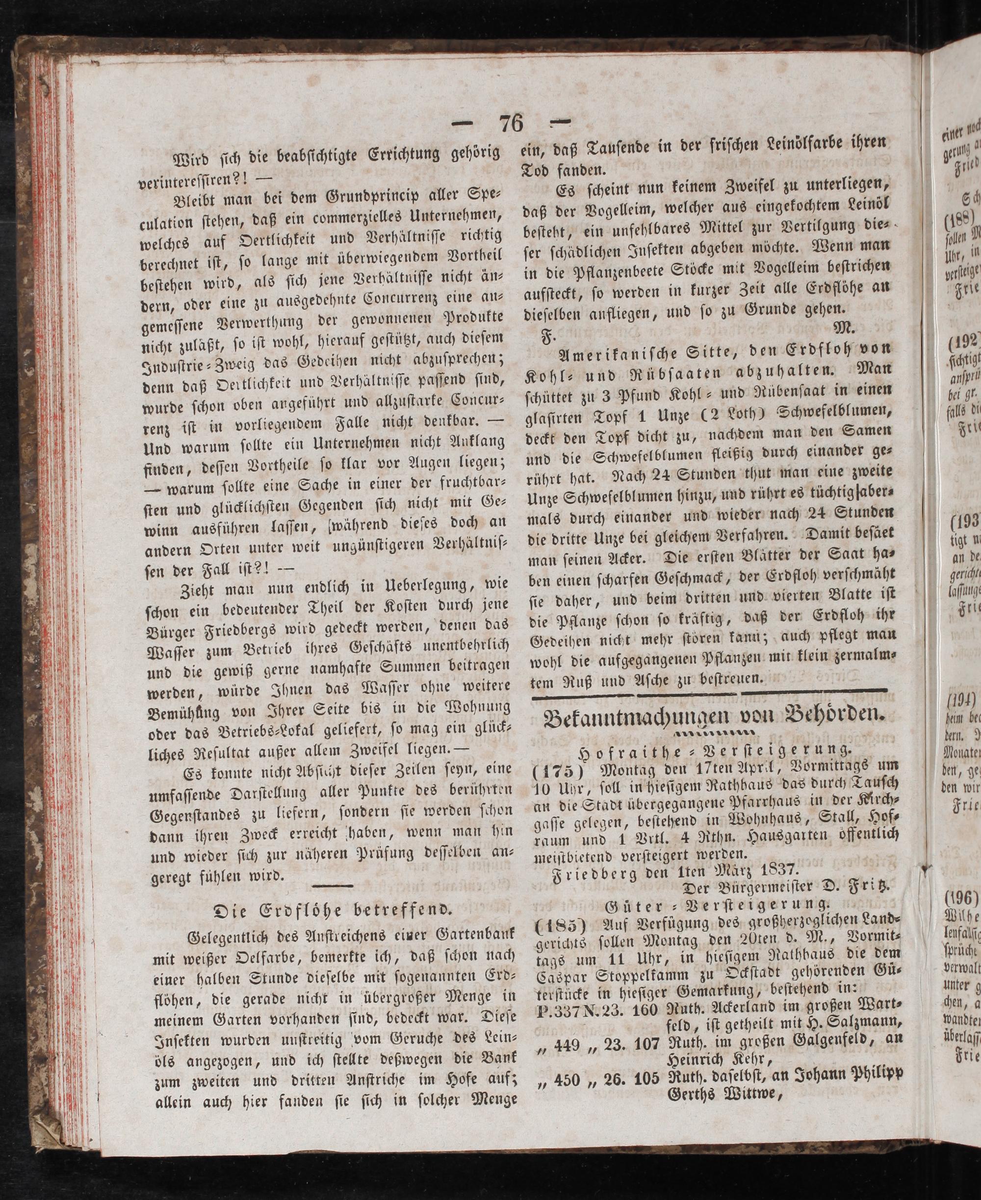 an die Stadt übergegangene Pfarrhaus in der Kirch⸗ gaſſe gelegen, beſtehend in Wohnhaus, Stall, Hof⸗ raum und 1 VPrtl. 4 Rthn. Hausgarten offentlich meiſtbietend verſteigert werden. Friedberg den Iten März 1837. Der Bürgermeiſter D. Fritz. Güter ⸗Verſteigerung. (185) Auf Verfügung des großherzoglichen Land⸗ gerichts ſollen Montag den 20ten d. M., Vormit⸗ tags um 11 Uhr, in hieſigem Nathbaus die dem Caspar Stoppelkamm zu Ockſtadt gehörenden Guͤ⸗ terſtücke in hieſiger Gemarkung, beſtehend in: P. 337 N. 23. 160 Ruth. Ackerland im großen Wart⸗ feld, iſt getheilt mit H. Salzmann, „ 449„23. 107 Ruth. im großen Galgenfeld, an Heinrich Kehr, „ 450„ 26. 105 Ruth. daſelbſt, an Johann Philipp Gerths Wittwe,