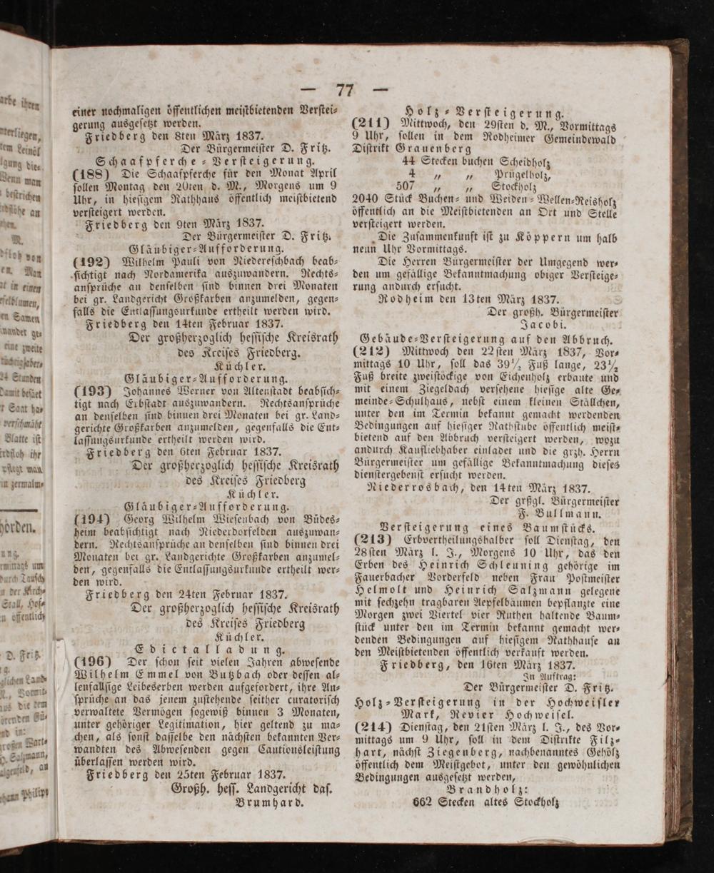 Holz ⸗Verſteigerung. (211) Mittwoch, den 29ſten d. M., Vormittags 9 Uhr, ſollen in dem Rodheimer Gemeindewald Diſtrikt Grauenberg 44 Stecken buchen Scheidholz 4„ 15 Prügelholz, 507,„ Stockholz 2040 Stück Buchen- und Weiden⸗Wellen⸗Reisholz öffentlich an die Meiſtbietenden an Ort und Stelle verſteigert werden. „Die Zuſammenkunft iſt zu Köppern um halb neun Uhr Vormittags. a Die Herren Buͤrgermeiſter der Umgegend wer— den um gefällige Bekanntmachung obiger Verſteige— rung andurch erſucht. Rodheim den 13ten März 1837. Der großh. Bürgermeiſter Jacobi. Gebäude-Verſteigerung auf den Abbruch. (212) Mittwoch den 22ſten März 1837, Vor- mittags 10 Uhr, ſoll das 39½ Fuß lange, 23½ Fuß breite zweiſtoͤckige von Eichenholz erbaute und mit einem Ziegeldach verſehene hieſige alte Ge— meinde-Schulhaus, nebſt einem kleinen Ställchen, unter den im Termin bekannt gemacht werdenden Bedingungen auf hieſiger Rathſtube öffentlich meiſt— bietend auf den Abbruch verſteigert werden, wozu andurch Kaufliebhaber einladet und die grzh. Herrn Bürgermeiſter um gefällige Bekanntmachung dieſes dienſtergebenſt erſucht werden. Niederrosbach, den 14ten Maͤrz 1837. Der grßgl. Bürgermeiſter F. Bullmann. Verſteigerung eines Baumſtücks. (213) Erbvertheilungsbalber ſoll Dienſtag, den 28 ſten März l. J., Morgens 10 Uhr, das den Erben des Heinrich Schleuning gehörige im Fauerbacher Vorderfeld neben Frau Poſtmeiſter Helmolt und Heinrich Salzmann gelegene mit ſechzehn tragbaren Aepfelbaumen bepflanzte eine Morgen zwei Viertel vier Ruthen haltende Baum— ſtück unter den im Termin bekannt gemacht wer— denden Bedingungen auf hieſigem Nathhauſe an den Meiſtbietenden öffentlich verkauft werden. Friedberg, den 16ten März 1837. In Auftrag: