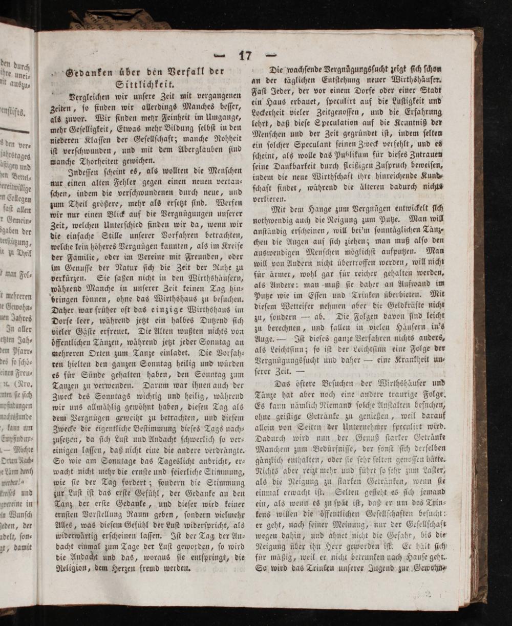 Daher war früher oft das einzige Wirthshaus im Dorfe leer, während jetzt ein halbes Dutzend ſich vieler Gäſte erfreuet. Die Alten wußten nichts von offentlichen Tänzen, während jetzt jeder Sonntag an mehreren Orten zum Tanze einladet. Die Vorfah— ten hielten den ganzen Sonntag heilig und würden es für Sünde gehalten haben, den Sonntag zum Tanzen zu verwenden. Darum war ihnen auch der Zweck des Sonntags wichtig und heilig, während wir uns allmählig gewöhnt haben, dieſen Tag als dem Vergnügen geweiht zu betrachten, und dieſem Zwecke die eigentliche Beſtimmung dieſes Tags nach— zuſetzen, da ſich Luſt und Andacht ſchwerlich ſo ver— einigen laſſen, daß nicht eine die andere verdrängte. So wie am Sonntage das Tageslicht anbricht, er— wacht nicht mehr die ernſte und feierliche Stimmung, wie ſie der Tag fordert; ſondern die Stimmung zur Luſt iſt das erſte Gefühl, der Gedanke an den Tanz der erſte Gedanke, und dieſer wird keiner ernſten Vorſtellung Raum geben, ſondern vielmehr Alles, was dieſem Gefühl der Luſt widerſpricht, als widerwärtig erſcheinen laſſen. Iſt der Tag der An— dacht einmal zum Tage der Luſt geworden, ſo wird die Andacht und das, woraus ſie entſpringt, die Religion, dem Herzen fremd werden.