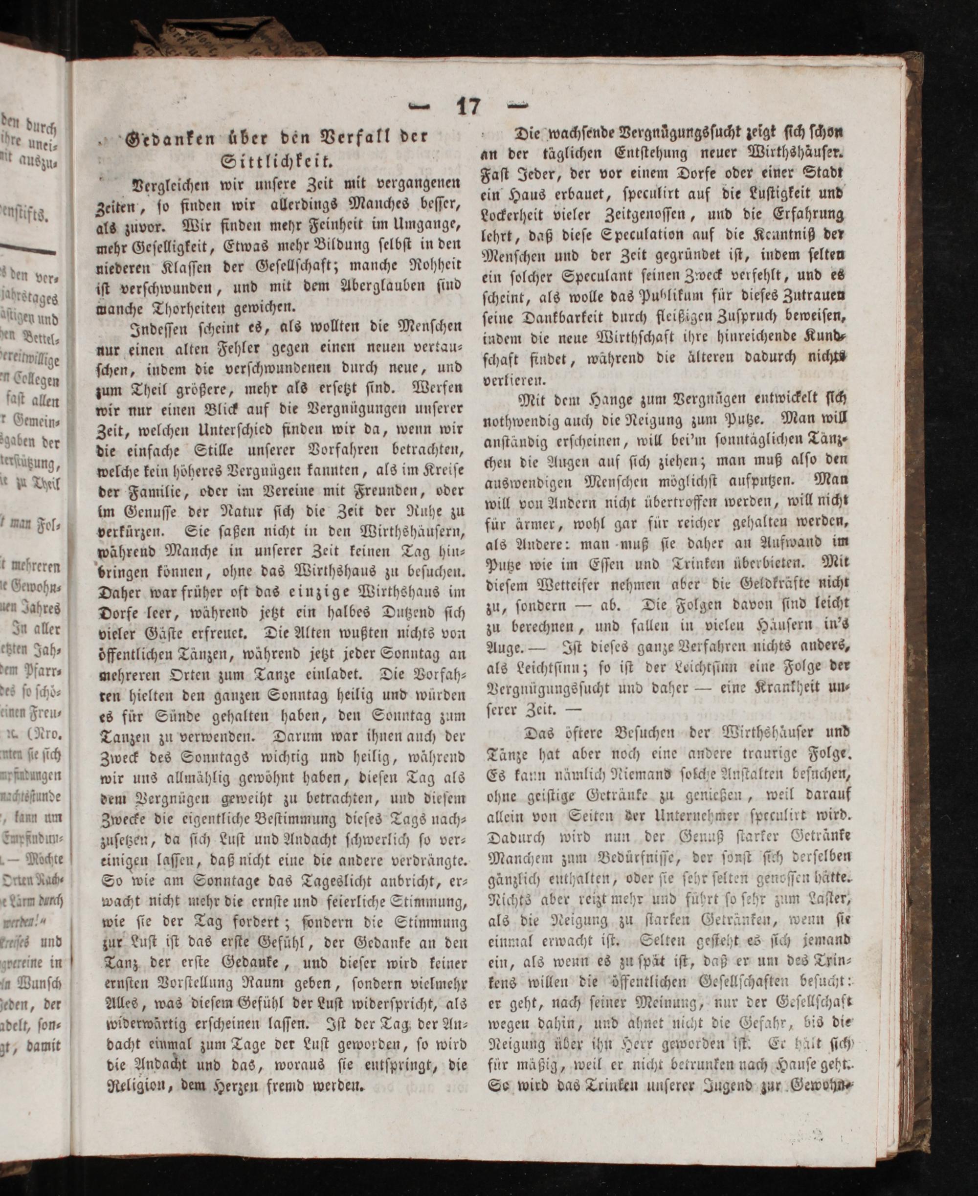 Indeſſen ſcheint es, als wollten die Menſchen nur einen alten Fehler gegen einen neuen vertau— ſchen, indem die verſchwundenen durch neue, und zum Theil größere, mehr als erſetzt ſind. Werfen wir nur einen Blick auf die Vergnügungen unſerer Zeit, welchen Unterſchied finden wir da, wenn wir die einfache Stille unſerer Vorfahren betrachten, welche kein höheres Vergnügen kannten, als im Kreiſe der Familie, oder im Vereine mit Freunden, oder im Genuſſe der Natur ſich die Zeit der Ruhe zu verkürzen. Sie ſaßen nicht in den Wirthshäuſern, während Manche in unſerer Zeit keinen Tag hin—