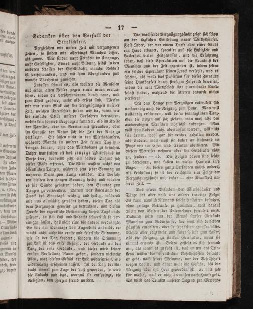 Vergleichen wir unſere Zeit mit vergangenen Zeiten, ſo finden wir allerdings Manches beſſer, als zuvor. Wir finden mehr Feinheit im Umgange, mehr Geſelligkeit, Etwas mehr Bildung ſelbſt in den niederen Klaſſen der Geſellſchaft; manche Rohheit iſt verſchwunden, und mit dem Aberglauben ſind manche Thorheiten gewichen.