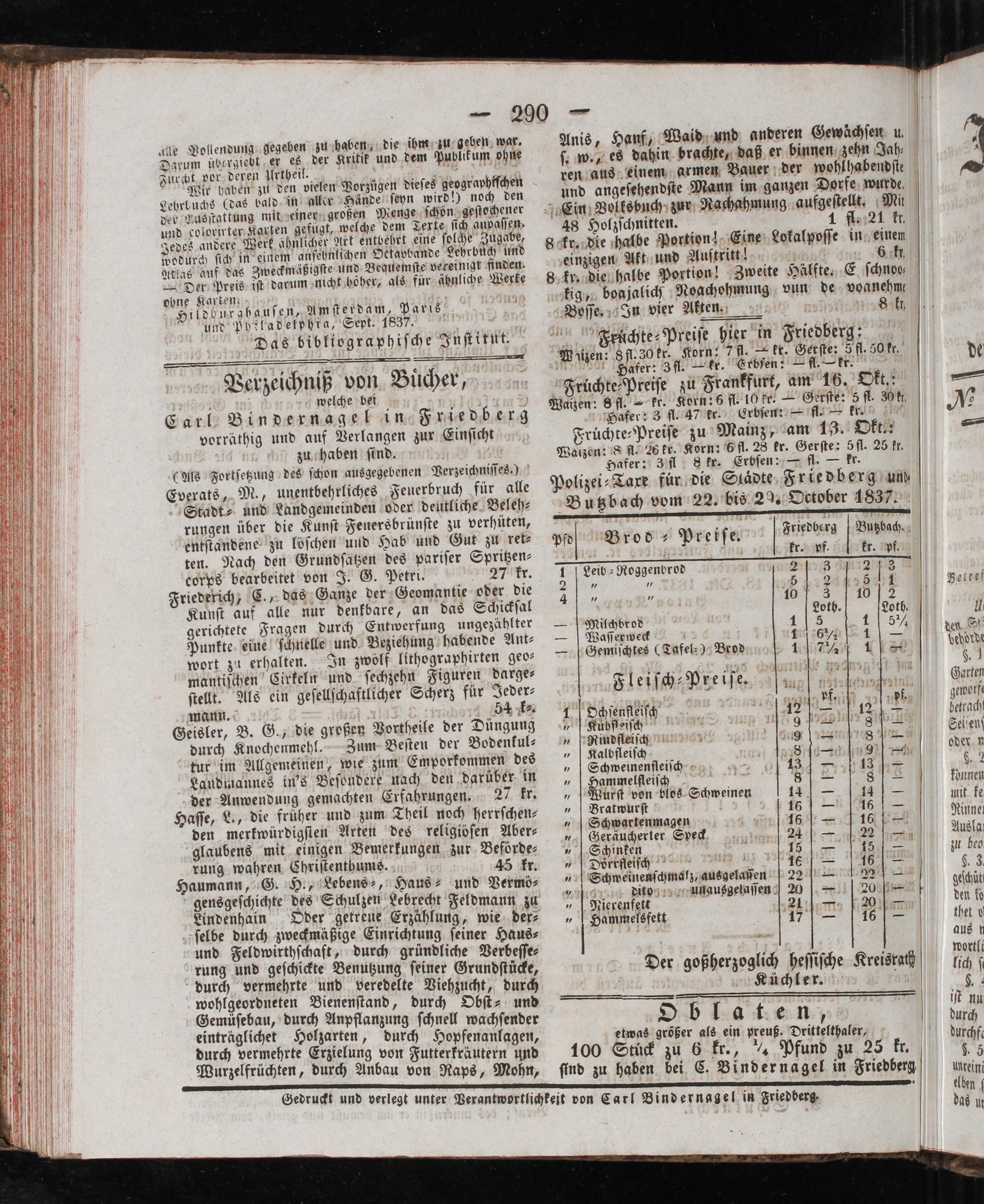 Hafer: 3 fl. 47 kr. Erbſen:— fl.— k. Früchte⸗Preiſe zu Mainz, am 13. Okt: Walzen: 8 fl. 26 kr. Korn: 6 fl. 28 kr. Gerſte: 5fl. 25 ft. Hafer: 3 fl. 8 kr. Erbſen:— fl.— kr. Polizei⸗Taxe fuͤr die Staͤdte Friedberg un Butzbach vom 22. bis 23. October 1837.