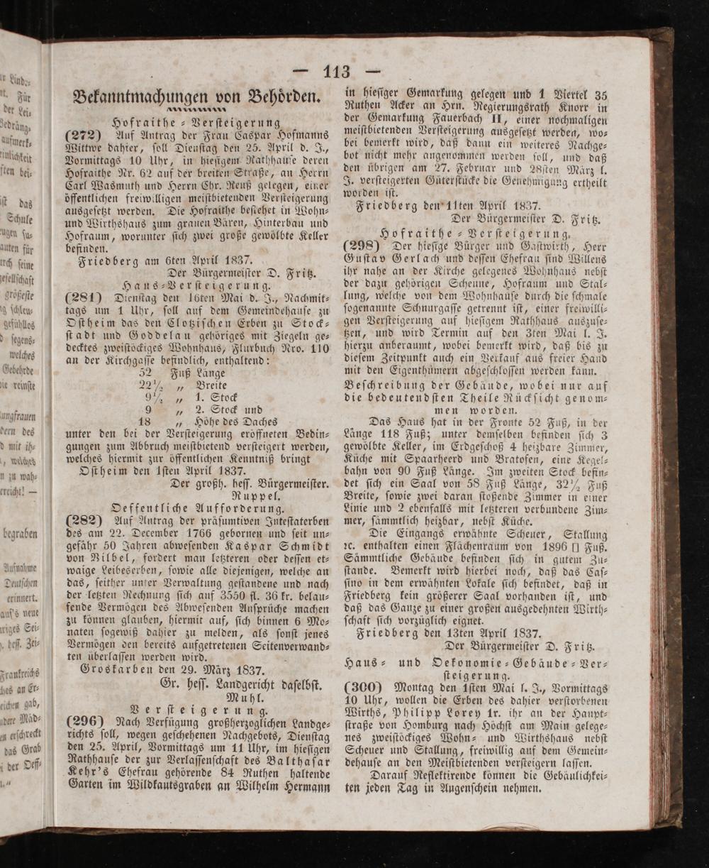 befinden. Friedberg am sten April 1837. Der Bürgermeiſter D. Fritz. Haus-Verſteigerung. (281) Dienſtag den 16ten Mai d. J., Nachmit— tags um 1 Uhr, ſoll auf dem Gemeindehauſe zu Oſtheim das den Clotziſchen Erben zu Stock— ſtadt und Goddelau gehöriges mit Ziegeln ge— decktes zweiſtöckiges Wohnhaus, Flurbuch Nro. 110 an der Kirchgaſſe befindlich, enthaltend: 52 Fuß Länge Lp reite I Stock 9 2. Stock und 18„ Höhe des Daches unter den bei der Verſteigerung eröffneten Bedin— gungen zum Abbruch meiſtbietend verſteigert werden, welches hiermit zur öffentlichen Kenntniß bringt Oſtheim den Iſten April 1837. Der großh. heſſ. Buͤrgermeiſter. Ruppel. Oeffentliche Aufforderung. (282) Auf Antrag der präſumtiven Inteſtaterben des am 22. December 1766 gebornen und ſeit un gefähr 50 Jahren abweſenden Kaspar Schmidt von Vilbel, fordert man letzteren oder deſſen et— waige Leibeserben, ſowie alle diejenigen, welche an das, ſeither unter Verwaltung geſtandene und nach der letzten Rechnung ſich auf 3550 fl. 36 kr. belau⸗ fende Vermögen des Abweſenden Anſprüche machen zu können glauben, hiermit auf, ſich binnen 6 Mo— naten ſogewiß dahier zu melden, als ſonſt jenes Vermögen den bereits aufgetretenen Seitenverwand— ten überlaſſen werden wird.. Groskarben den 29. März 1837.