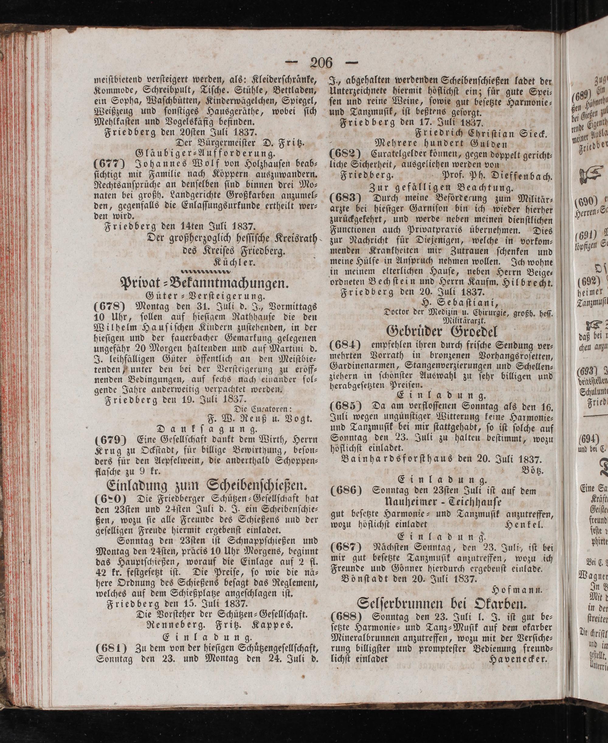 I.,, abgehalten werdenden Scheibenſchießen ladet der Unterzeichnete hiermit höflichſt ein; für gute Spei⸗ ſen und reine Weine, ſowie gut beſetzte Harmonie⸗ und Tanzmuſik, iſt beßtens geſorgt. Friedberg den 17. Juli 1837.. N Friedrich Chriſtian Sieck. 7 Mehrere hundert Gulden (682) Curatelgelder können, gegen doppelt gericht⸗ liche Sicherheit, ausgeliehen werden von Friedberg. Prof. Ph. Dieffenba ch. Zur gefälligen Beachtung. (683) Durch meine Beförderung zum Militär⸗ arzte bei hieſiger Garniſon bin ich wieder hierher zurückgekehrt, und werde neben meinen dienſtlichen Functionen auch Privatpraris übernehmen. Dies zur Nachricht für Diejenigen, welche in vorkom⸗ menden Krankheiten mir Zutrauen ſchenken und meine Hülfe in Anſpruch nehmen wollen. Ich wohne in meinem elterlichen Hauſe, neben Herrn Beige— ordneten Bechſtein und Herrn Kaufm. Hilbrecht. Friedberg den 20. Juli 1837. H. Sebaſtiani, Doctor der Medizin u. Chirurgie, großh. heſſ. 5 Militärarzt. Gebruͤder Groedel i (684) empfehlen ihren durch friſche Sendung ver⸗ mehrten Vorrath in bronzenen Vorhangsroſetten, Gardinenarmen, Stangenverzierungen und Schellen⸗ ziehern in ſchönſter Auswahl zu ſehr billigen und herabgeſetzten Preiſen. Einladung. (685) Da am verfloſſenen Sonntag als den 16. Juli wegen ungünſtiger Witterung keine Harmonie⸗ und Tanzmuſik bei mir ſtattgehabt, ſo iſt ſolche auf Sonntag den 23. Juli zu halten beſtimmt, wozu höflichſt einladet. f ö Bainhardsforſthaus den 20. Juli 1837.