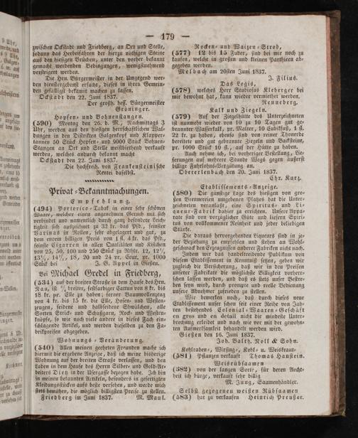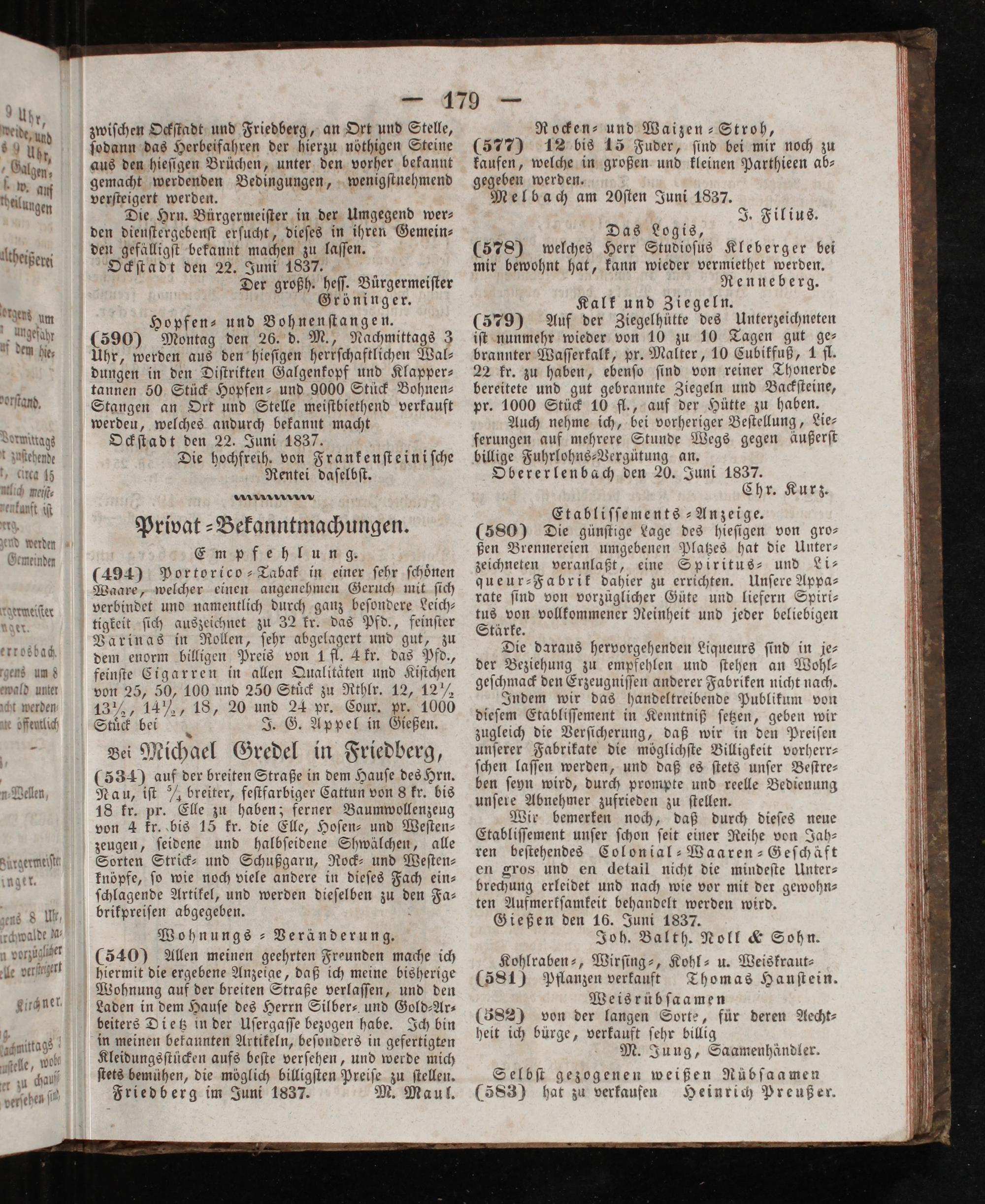 Ockſtadt den 22. Juni 1837. Der großh. heſſ. Bürgermeiſter Gröninger. Hopfen⸗ und Bohnenſtangen. (590) Montag den 26. d. M., Nachmittags 3 Uhr, werden aus den hieſigen herrſchaftlichen Wal— dungen in den Diſtrikten Galgenkopf und Klapper⸗ tannen 50 Stück Hopfen- und 9000 Stück Bohnen⸗ Stangen an Ort und Stelle meiſtbiethend verkauft werdeu, welches andurch bekannt macht Ockſtadt den 22. Juni 1837. Die hochfreih. von Frankenſteiniſche Rentei daſelbſt.