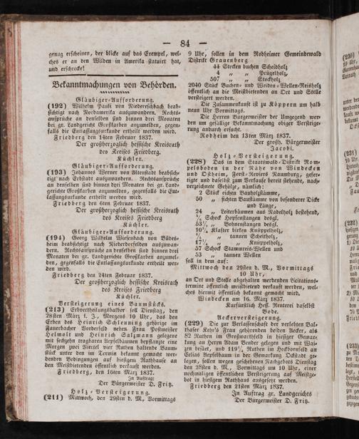 Gläubiger-Aufforderung. (192) Wilhelm Pauli von Niedereſchbach beab⸗ ſichtigt nach Nordamerika auszuwandern. Rechts— auſprüche an denſelben ſind binnen drei Monaten bei gr. Landgericht Großkarben anzumelden, gegen— falls die Entlaſſungsurkunde ertheilt werden wird. Friedberg den 14ten Februar 1837. Der großherzoglich heſſiſche Kreisrath des Kceiſes Friedberg. Küchler. Gläubiger⸗ Aufforderung. 1193) Johannes Werner von Altenſtadt beabſich⸗ tigt nach Erbſtadt auszuwandern. Rechtsanſprüche an denſelben ſind binnen drei Monaten bei gr. Land— gerichte Großkarben anzumelden, gegenfalls die Ent— laſſungsurkunde ertheilt werden wird. Friedberg den Eten Februar 1837. Der großherzoglich heſſiſche Kreisrath des Kreiſes Friedberg Küchler. Gläubiger⸗Aufforderung. (194) Georg Wilhelm Wieſenbach von Buͤdes⸗ heim beabſichtigt nach Niederdorfelden auszuwan— dern. Nechtsanſprüche an denſelben ſind binnen drei Monaten bei gr. Landgerichte Großkarben anzumel— den, gegenfalls die Entlaſſungsurkunde ertheilt wer⸗ den wird. Friedberg den 24ten Februar 1837. Der großherzoglich heſſiſche Kreisrath des Kreiſes Friedberg Küchler. Verſteigernng eines Baumſtuͤcks. (213) Erbvertheilungshalber ſoll Dienſtag, den 28 ſten März l. J., Morgens 10 Uhr, das den Erben des Heinrich Schleuning gehörige im Fauerbacher Vorderfeld neben Frau Poſtmeiſter Helmolt und Heinrich Salzmann gelegene mit ſechzehn tragbaren Aepfelbäumen bepflanzte eine Morgen zwei Viertel vier Ruthen haltende Baum⸗ ſtück unter den im Termin bekannt gemacht wer⸗ denden Bedingungen auf hieſigem Rathhauſe an den Meiſtbietenden öffentlich verkauft werden. Friedberg, den 16ten Maͤrz 1837. In Auftrag: Der Bürgermeiſter D. Fritz. Holz ⸗Verſteigerung. 1211) Mittwoch, den 29ſten d. M., Vormittags