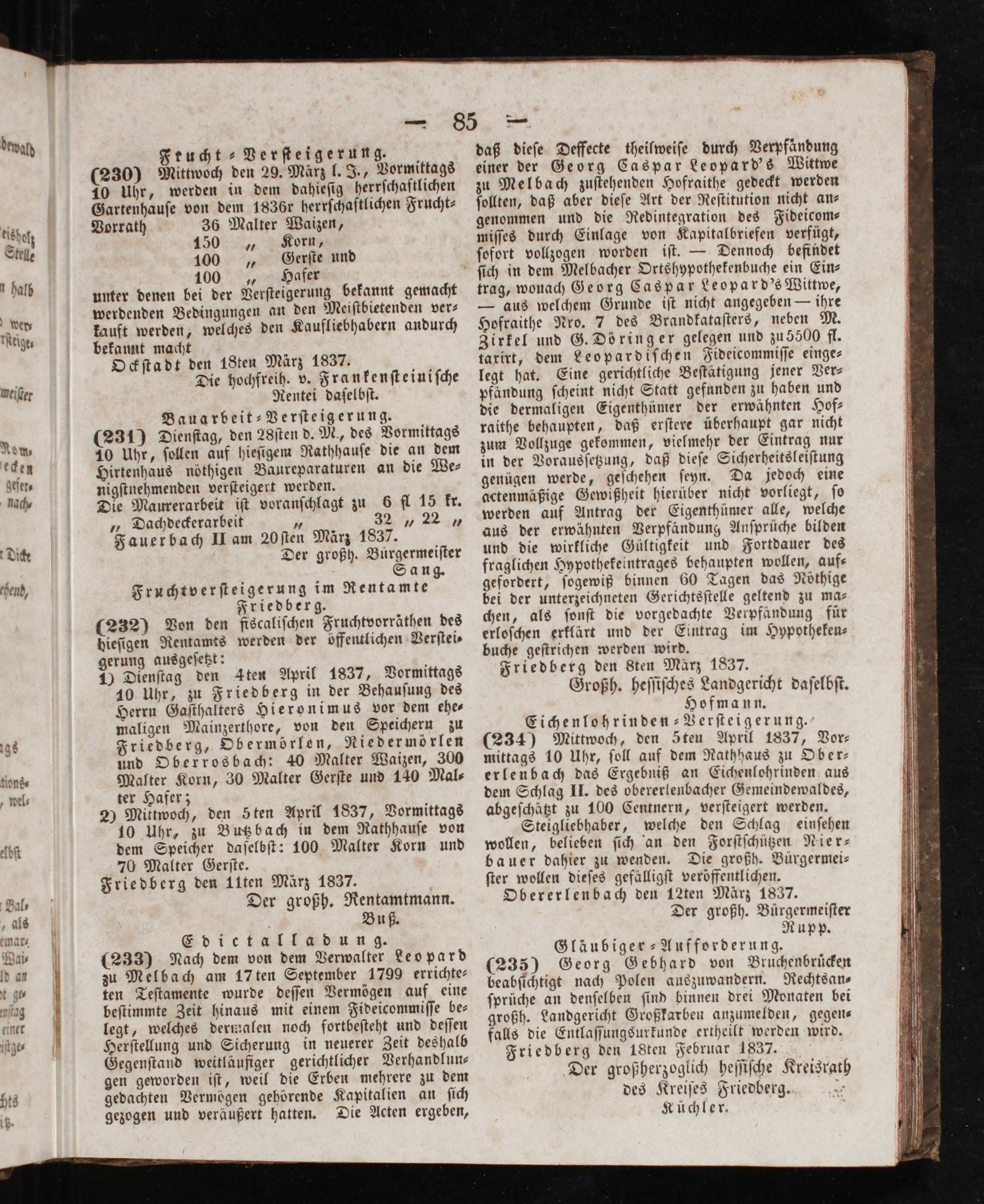 daß dieſe Deffecte theilweiſe durch Verpfändung einer der Georg Caspar Leopard's Wittwe zu Melbach zuſtehenden Hofraithe gedeckt werden ſollten, daß aber dieſe Art der Reſtitution nicht an⸗ genommen und die Redintegration des Fideicom⸗ miſſes durch Einlage von Kapitalbriefen verfügt, ſofort vollzogen worden iſt.— Dennoch befindet ſich in dem Melbacher Ortshypothekenbuche ein Ein⸗ trag, wonach Georg Caspar Leopard's Wittwe, — aus welchem Grunde iſt nicht angegeben— ihre Hofraithe Nro. 7 des Brandkataſters, neben M. Zirkel und G. Dö ringer gelegen und zu 5500 fl. taxirt, dem Leopardiſchen Fideicommiſſe einge⸗ legt hat. Eine gerichtliche Beſtätigung jener Ver⸗ pfändung ſcheint nicht Statt gefunden zu haben und die dermaligen Eigenthümer der erwähnten Hof⸗ raithe behaupten, daß erſtere überhaupt gar nicht zum Vollzuge gekommen, vielmehr der Eintrag nur in der Vorausſetzung, daß dieſe Sicherheitsleiſtung genügen werde, geſchehen ſeyn. Da jedoch eine actenmäßige Gewißheit hierüber nicht vorliegt, ſo werden auf Antrag der Eigenthümer alle, welche aus der erwähnten Verpfändung Anſprüche bilden und die wirkliche Gültigkeit und Fortdauer des fraglichen Hypothekeintrages behaupten wollen, auf⸗ gefordert, ſogewiß binnen 60 Tagen das Nöthige bei der unterzeichneten Gerichtsſtelle geltend zu ma⸗ chen, als ſonſt die vorgedachte Verpfändung für erloſchen erklärt und der Eintrag im Hypotheken⸗ buche geſtrichen werden wird. Friedberg den Sten Marz 1837. Großh. heſſiſches Landgericht daſelbſt. Hofmann. Eichenlohrinden-Verſteigerung. (234) Mittwoch, den Sten April 1837, Vor⸗ mittags 10 Uhr, ſoll auf dem Rathhaus zu Ober⸗ erlenbach das Ergebniß an Eichenlohrinden aus dem Schlag II. des obererlenbacher Gemeindewaldes, abgeſchätzt zu 100 Centnern, verſteigert werden. Steigliebhaber, welche den Schlag einſehen wollen, belieben ſich an den Forſtſchützen Nier⸗ bauer dahier zu wenden. Die großh. Bürgermei— ſter wollen dieſes gefälligſt veröffentlichen. Obererlenbach den 12ten März 1837. Der großh. Bürgermeiſter Rupp. Gläubiger-Aufforderung. (235) Georg Gebhard von Bruchenbruͤcken beabſichtigt nach Polen auszuwandern. Rechtsan⸗ ſprüche an denſelben ſind binnen drei Monaten bei großh. Landgericht Großkarben anzumelden, gegen⸗ falls die Entlaſſungsurkunde ertheilt werden wird. Friedberg den 18ten Februar 1837. Der groß herzoglich heſſiſche Kreisrath des Kreiſes Friedberg. 5 Küchler.
