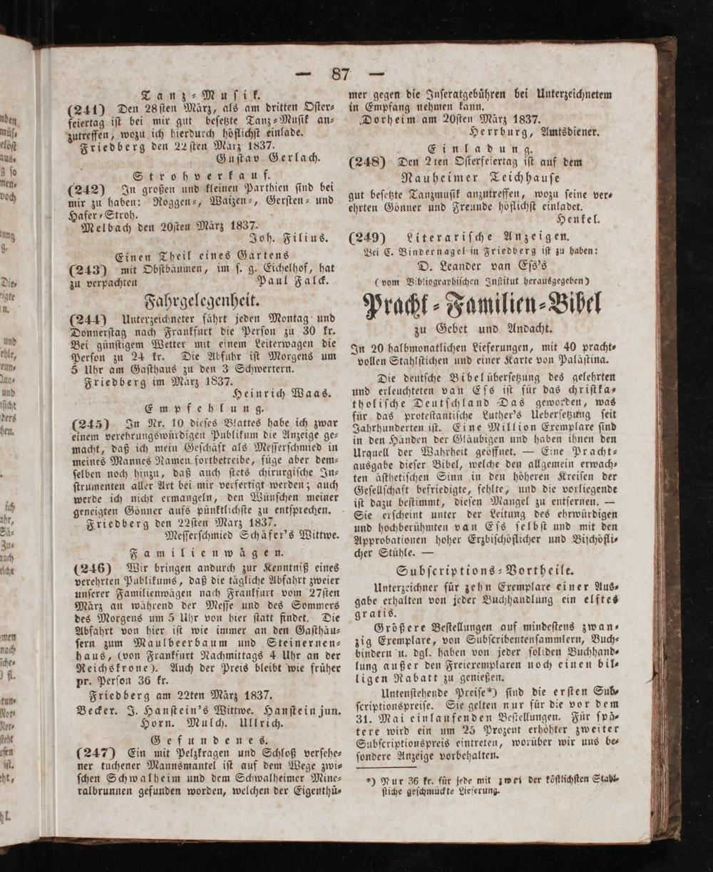 a Stroh verkauf. (242) In großen und kleinen Parthien ſind bei mir zu haben: Roggen-, Waizen⸗, Gerſten- und Hafer⸗Stroh. Melbach den 20ſten März 1837. Joh. Filius. Einen Theil eines Gartens (243) mit Obſtbaumen, im ſ. g. Eichelhof, hat zu verpachten Paul Falck. Fahrgelegenheit. (244) Unterzeichneter fährt jeden Montag und Donnerſtag nach Frankfurt die Perſon zu 30 kr. Bei günſtigem Wetter mit einem Leiterwagen die Perſon zu 24 kr. Die Abfuhr iſt Morgens um 5 Uhr am Gaſthaus zu den 3 Schwertern. Friedberg im Maͤrz 1837. Heinrich Waas. Empfehlung. (245) In Nr. 10 dieſes Blattes habe ich zwar einem verehrungswürdigen Publikum die Anzeige ge— macht, daß ich mein Geſchäft als Meſſerſchmied in meines Mannes Namen fortbetreibe, füge aber dem— ſelben noch hinzu, daß auch ſtets chirurgiſche In— ſtrumenten aller Art bei mir verfertigt werden; auch werde ich nicht ermangeln, den Wünſchen meiner geneigten Gönner aufs pünktlichſte zu entſprechen. Friedberg den 22ſten Marz 1837. Meſſerſchmied Schäfer's Wittwe. Familienwägen. (246) Wir bringen andurch zur Kenntniß eines verehrten Publikums, daß die tägliche Abfahrt zweier unſerer Familienwägen nach Frankfurt vom 27ſten März an während der Meſſe und des Sommers des Morgens um 5 Uhr von hier ſtatt findet. Die Abfahrt von hier iſt wie immer an den Gaſthäu— ſern zum Maulbeerbaum und Steinernen⸗ haus,(von Frankfurt Nachmittags 4 Uhr an der Reichskrone). Auch der Preis bleibt wie früher pr. Perſon 36 kr. Friedberg am 22ten März 1837.