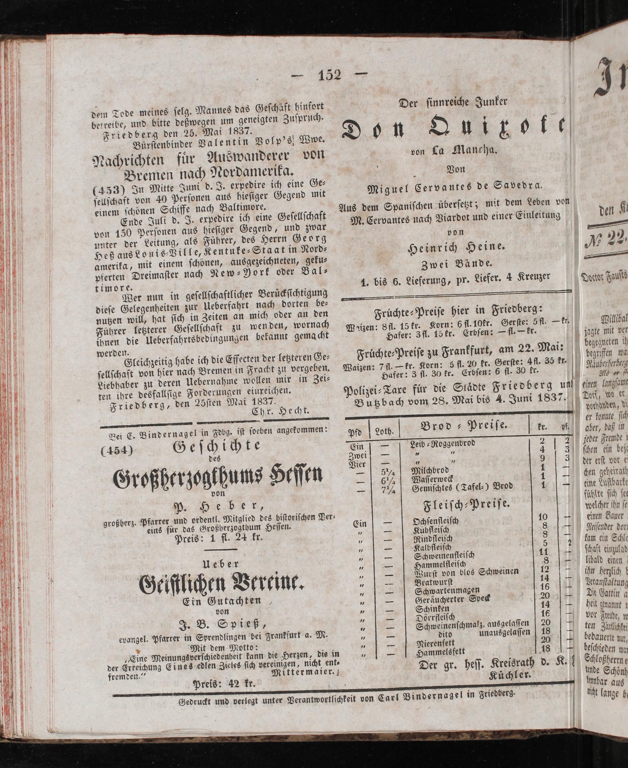Chr. Hecht. Bei C. Bindernagel in Fdbg. iſt ſoeben angekommen: pfd Loth. Brod-Preiſe.. 1— 2 (454) G e 0 ch l ch t e Ein Leib⸗Roggenbrod 2 2 des Zwei—*„ 3 Grosßerzeglbuns Heſtn. ee e, 5 22 Milchbrod 1 roßherzogthums Heſſen— 4 d 2 5 8 6 7% Gemiſchtes(Tafel⸗) Brod 1— r, 5. großherz. Pfarrer und ordentl. Mitglied des hiſtoriſchen Ver⸗ Fleiſch-Preiſe. eins für das Großherzogthum Heſſen. Ein Ochſenfleiſch 10 4 Preis: 1 fl. 24 kr. 1 3 Kübfleiſch 8— „— Rindfleiſch 8— 77 75 Kalbfleiſch 5 5 2 Ueber„— Schweinenfleiſch 11 5 5 f 5 1— Hammelfleiſch. 8 Geiſtli en Vereine 1 5 Wurſt von blos Schweinen W *„— e 40— . 1— chwartenmagen— Ein Gee 5„— Geräucherter Speck 20 25 0„ 5 Schinken 144 J. B. Spieß,„— S eu 1— 995 a. 3 25 e 07— chweinenſchmaſz, ausgelaſſen 0 1* 7 00 Pfarrer in e 5 Frankfurt a. M. 5 3 dito unausgelaſſen 18— „Eine Meinungsverſchiedenheit kann die Herzen, die in 0. e 155 1 der Erkeichung Eines edlen Zieles ſich vereinigen, nicht ent⸗ 8 5 f 0 fremden.“ Mittermaier.) Der gr. heſſ. Kreisrath d. K. Küchler.