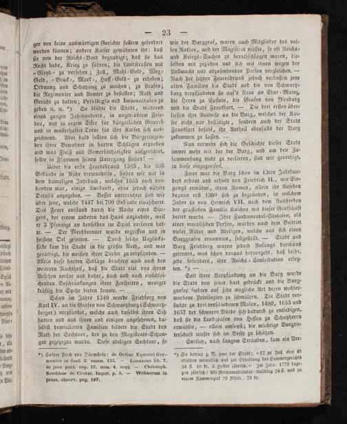 Zwar war die Burg ſchon im 13ten Jahrbun— dert erbaut und erhielt von Friedrich II., wie Ein⸗ gangs erwähnt, ihren Namen, allein ihr Anſehen begann erſt 1309 ſich zu begründen, in welchem Jahre ſie von Heinrich VII. nach dem Ausſterben der gräflichen Familie Kaichen mit dieſer Grafſchaft dotirt wurde.— Ihre Fundamental⸗Statuten, als einer moraliſchen Perſon, wurden nach dem Beitritt vieler Ritter und Adeligen, welche aus ſich einen Burggrafen ernannten, feſtgeſtellt.— Stadt und Burg Friedberg waren jedoch Anfangs durchaus getrennt, was ſchon daraus hervorgeht, daß beide, jede beſonders, ihre Reichs- Contribution erleg— tend
