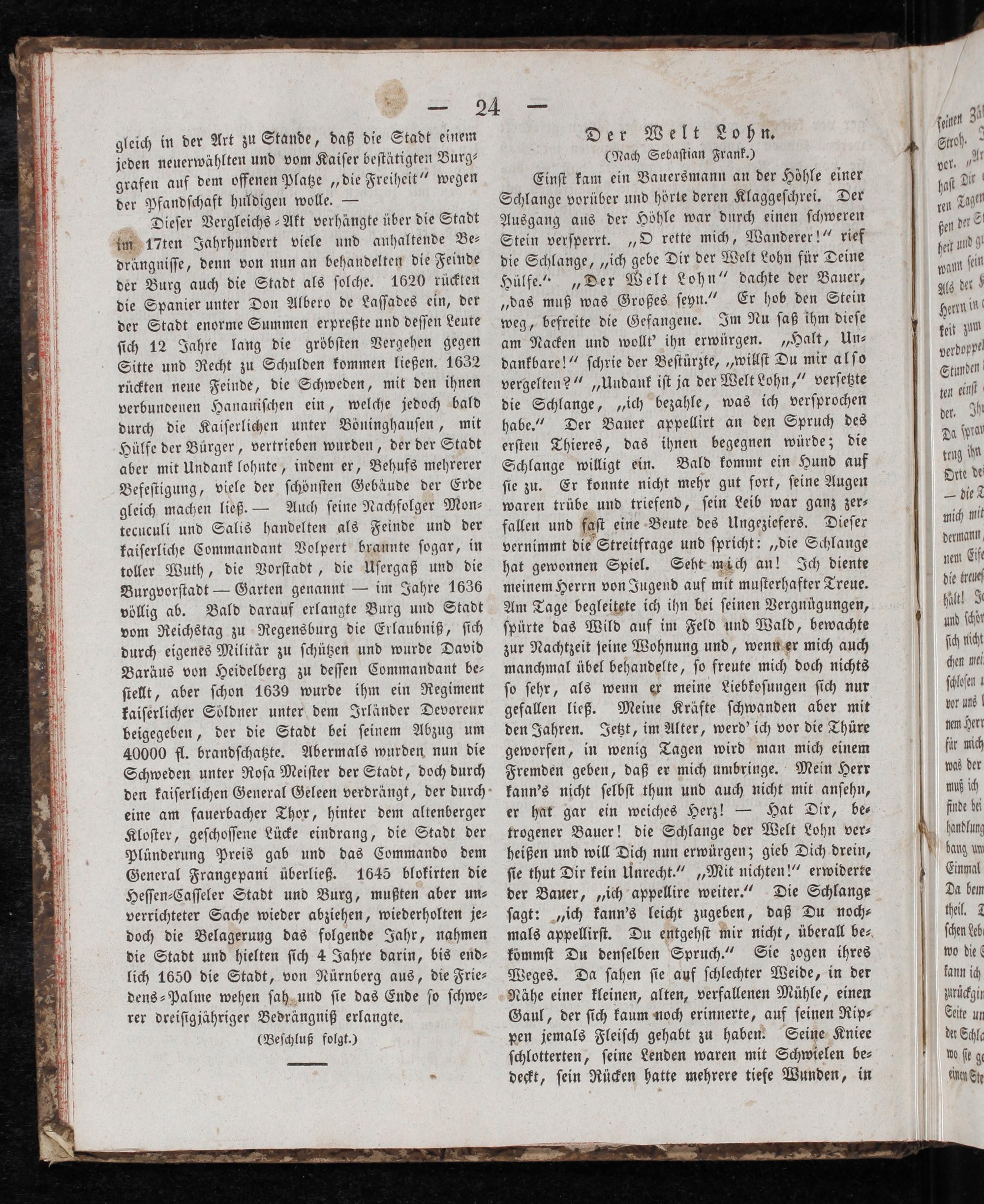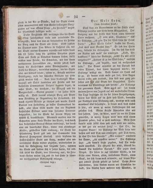 Einſt kam ein Bauersmann an der Höhle einer Schlange vorüber und hörte deren Klaggeſchrei. Der Ausgang aus der Höhle war durch einen ſchweren Stein verſperrt.„O rette mich, Wanderer!“ rief die Schlange,„ich gebe Dir der Welt Lohn für Deine Hülfe.“„Der Welt Lohn“ dachte der Bauer, „das muß was Großes ſeyn.“ Er hob den Stein weg, befreite die Gefangene. Im Nu ſaß ihm dieſe am Nacken und wollt' ihn erwürgen.„Halt, Un— dankbare!“ ſchrie der Beſtürzte,„willſt Du mir alſo vergelten?“„Undank iſt ja der Welt Lohn,“ verſetzte die Schlange,„ich bezahle, was ich verſprochen habe.“ Der Bauer appellirt an den Spruch des erſten Thieres, das ihnen begegnen würde; die Schlange willigt ein. Bald kommt ein Hund auf ſie zu. Er konnte nicht mehr gut fort, ſeine Augen waren trübe und triefend, ſein Leib war ganz zer— fallen und faſt eine Beute des Ungeziefers. Dieſer vernimmt die Streitfrage und ſpricht:„die Schlange hat gewonnen Spiel. Seht mäch an! Ich diente meinem Herrn von Jugend auf mit muſterhafter Treue. Am Tage begleitete ich ihn bei ſeinen Vergnügungen, ſpürte das Wild auf im Feld und Wald, bewachte zur Nachtzeit ſeine Wohnung und, wenn er mich auch manchmal übel behandelte, ſo freute mich doch nichts ſo ſehr, als wenn er meine Liebkoſungen ſich nur gefallen ließ. Meine Kräfte ſchwanden aber mit den Jahren. Jetzt, im Alter, werd' ich vor die Thüre geworfen, in wenig Tagen wird man mich einem Fremden geben, daß er mich umbringe. Mein Herr kann's nicht ſelbſt thun und auch nicht mit anſehn, er hat gar ein weiches Herz!— Hat Dir, be— trogener Bauer! die Schlange der Welt Lohn ver⸗ heißen und will Dich nun erwürgen; gieb Dich drein, ſie thut Dir kein Unrecht.“„Mit nichten!“ erwiderte der Bauer,„ich appellire weiter.“ Die Schlange ſagt:„ich kann's leicht zugeben, daß Du noch⸗ mals appellirſt. Du entgehſt mir nicht, überall be⸗ kömmſt Du denſelben Spruch.“ Sie zogen ihres Weges. Da ſahen ſie auf ſchlechter Weide, in der Nähe einer kleinen, alten, verfallenen Mühle, einen Gaul, der ſich kaum noch erinnerte, auf ſeinen Rip⸗ pen jemals Fleiſch gehabt zu haben. Seine Kniee ſchlotterten, ſeine Lenden waren mit Schwielen be⸗ deckt, ſein Rücken hatte mehrere tiefe Wunden, in