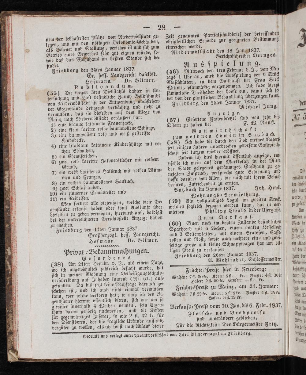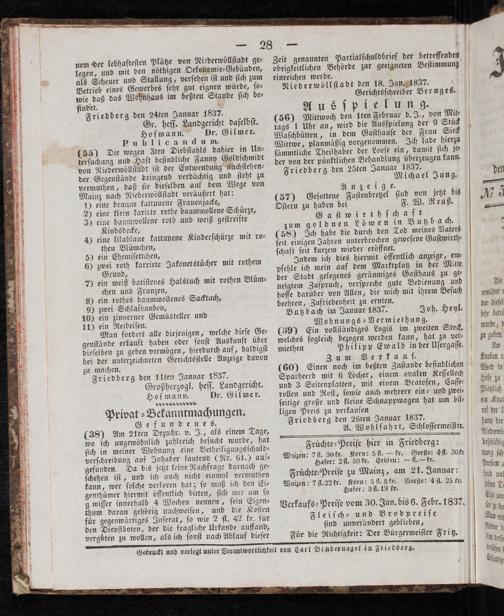 Friedberg den Iten Januar 1837. Großherzogl. heſſ. Landgericht. Hofmann. Dr. Gilmer. Privat⸗ Bekanntmachungen. Gefundenes. (38) Am 21ten Dezmbr. v. J., als einem Tage, wo ich ungewöhnlich zahlreich beſucht wurde, hat ſich in meiner Wohnung eine Betheiligungsſchuld— verſchreibung auf Inhaber lautend(Nr. 61.) auf⸗ gefunden. Da bis jetzt keine Nachfrage darnach ge⸗ ſchehen iſt, und ich auch nicht einmal vermuthen kann, wer ſolche verloren hat; ſo muß ich den Ei⸗ genthümer hiermit öffentlich bitten, ſich mir um ſo g wiſſer innerhalb 4 Wochen nennen, ſein Eigen⸗ thum daran gehörig nachweiſen, und die Koſten für gegenwärtiges Inſerat, ſo wie 2 fl. 42 kr. für den Dienſtboten, der die fragliche Urkunde auffand, verguͤten zu wollen, als ich ſonſt nach Ablauf dieſer