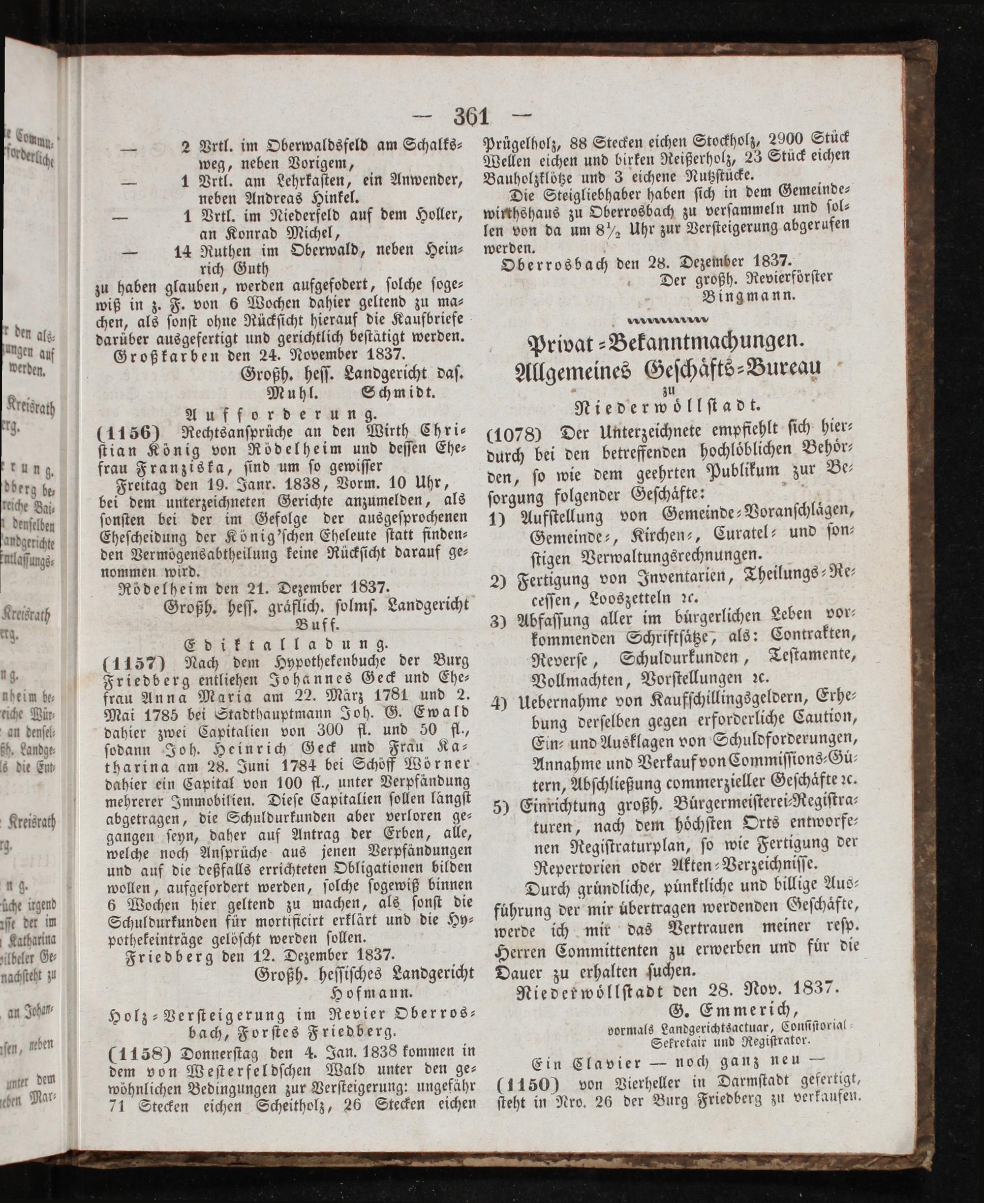 2 2 rtl. im Oberwaldsfeld am Schalks— weg, neben Vorigem, — 1 Vrtl. am Lehrkaſten, ein Anwender, neben Andreas Hinkel. — 1 Prtl. im Niederfeld auf dem Holler, an Konrad Michel, — 14 Ruthen im Oberwald, neben Hein⸗ rich Guth zu haben glauben, werden aufgefodert, ſolche ſoge⸗ wiß in z. F. von 6 Wochen dahier geltend zu ma⸗ chen, als ſonſt ohne Rückſicht hierauf die Kaufbriefe darüber ausgefertigt und gerichtlich beſtätigt werden. Großkarben den 24. November 1837. Großh. heſſ. Landgericht daſ. Muhl. Schmidt. Aufforderung. (1156) Rechtsanſprüche an den Wirth Chri⸗ ſtian König von Rödelheim und deſſen Ehe— frau Franziska, ſind um ſo gewiſſer Freitag den 19. Janr. 1838, Vorm. 10 Uhr, bei dem unterzeichneten Gerichte anzumelden, als ſonſten bei der im Gefolge der ausgeſprochenen Eheſcheidung der König'ſchen Eheleute ſtatt finden⸗ den Vermögensabtheilung keine Rückſicht darauf ge⸗ nommen wird. Rödelheim den 21. Dezember 1837.