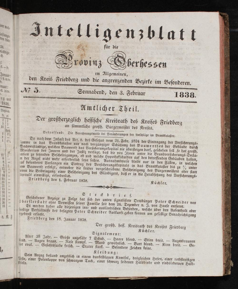 ie von Ihnen unter die Brandverſicherungs-Decla⸗ 1 ation zu ſetzenden Beſcheinigungen, ob und welche Hypothekſchulden auf den betreffenden Gebäuden haften, 2 u der Regel nicht mehr erforderlich ſeyn ſollen. Ausnahmsweiſe bleibt nur in den Fällen, in welchen 3 uf beſonderes Verlangen ein Eintrag des Verſicherungskapitals in das Brandkataſter bis zu% unter 64 2 em Bauwerth erfolgt, entweder die früher vorgeſchriebene Beſcheinigung des Bürgermeiſters oder ſtatt E eren die Beibriugung einer Beſcheinigung des Gläubigers, daß er in die Herabſetzung des Verſicherungs⸗ 4— apitals einwillige, erforderlich. * Friedberg den 1. Februar 1838. a Kuͤchler. 16— 3 2 2—— W 0W ,t 1— Set e ck beine 5 Geſchehener Anzeige zu Folge hat ſich der unten ſignaliſirte Ortsbürger Peter Schneider von f 18 berflorſtadt ohne Vorwiſſen ſeiner Familie ſeit dem 26. Dezember v. J. von Hauſe entfernt. 16 Es werden daher alle diejenigen inn und ausländiſchen Behörden, welche über den Aufenthalt oder Aſſige Verhältniſſe des beſagten Peter Schneider Auskunft geben können um gefällige Benachrichtigung „gebenſt erſucht. d. K. F Friedberg den 18. Januar 1838.