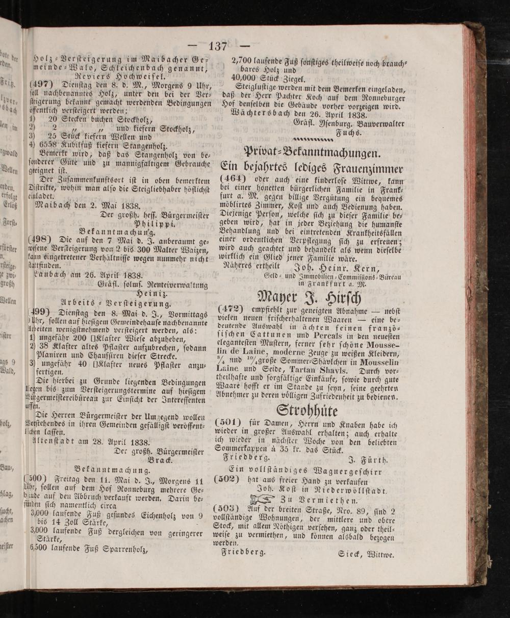 Der großh. heſſ. Burgermeiſter Philippi. Bekanntmachung. (498) Die auf den 7 Mai d. J. anberaumt ge⸗ weſene Verſteigerung von 2 bis 300 Malter Waizen, kann eingetretener Verhältniſſe wegen nunmehr nicht ſtattfinden. Laubach am 26. April 1838. Graͤfl. ſolmſ. Renteiverwaltung Heiniz. Arbeits-Verſteigerung. 199) Dienſtag den 8. Mai d. J., Vormittags Uhr, ſollen auf hieſigem Gemeindehauſe nachbenannte Acbeiten wenigſtnehmend verſteigert werden, als: 1) ungefähr 200[IKlafter Wieſe abzuheben, 2 38 Klafter altes Pflaſter aufzubrechen, ſodann