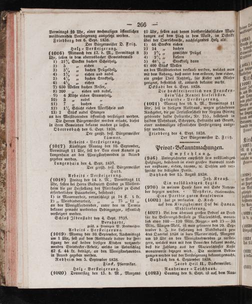 13) 2 Stück nadel Stangen an den Meiſtbietenden öffentlich verſteigert werden. Die Herren Bürgermeiſter werden erſucht, dieſes in ihren Gemeinden bekannt machen zu laſſen. Oberrosbach den 6. Sept. 1838. Der großh. heſſ. Bürgermeiſter Lämmer. 8 Arbeits-Verſteigerung. (1017) Künftigen Montag den 10. September, Vormittags 11 Uhr, ſoll der Bau eines Kanals zu Langenhain an den Wenigſtnehmenden in Accord gegeben werden. Langenhain den 4. Sept. 1838. f Der großh. heſſ. Bürgermeiſter Huth.