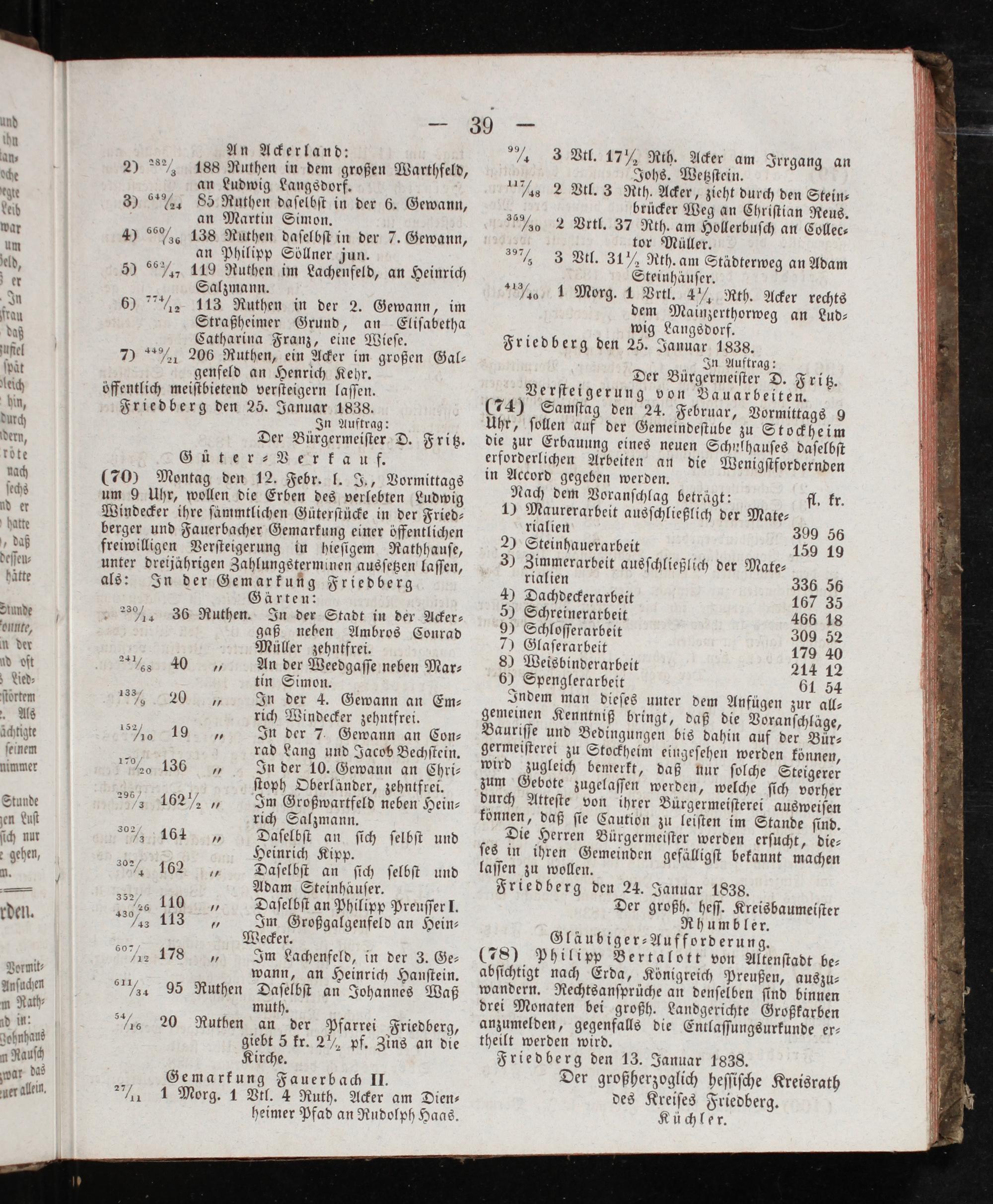 an Martin Simon. 4)% 138 Ruthen daſelbſt in der 7. Gewann, an Philipp Söllner jun. 5) 88% 119 Ruthen im Lachenfeld, an Heinrich Salzmann. b 6) 7 113 Ruthen in der 2. Gewann, im Straßheimer Grund, an Eliſabetha Catharina Franz, eine Wieſe. 7 ν⁹⁹⁰⁴e 206 Ruthen, ein Acker im großen Gal— genfeld an Henrich Kehr. öffentlich meiſtbietend verſteigern laſſen. Friedberg den 25. Januar 1838. In Auftrag: Der Bürgermeiſter D. Fritz. Gb aner Verkauf. (70) Montag den 12. Febr. l. J., Vormittags um 9 Uhr, wollen die Erben des verlebten Ludwig Windecker ihre ſämmtlichen Güterſtücke in der Fried⸗ berger und Fauerbacher Gemarkung einer öffentlichen freiwilligen Verſteigerung in hieſigem Rathhauſe, unter dreijährigen Zahlungsterminen ausſetzen laſſen, als: In der Gemarkung Friedberg Gärten: % 36 Ruthen. In der Stadt in der Acker⸗ gaß neben Ambros Conrad Müller zehntfrei.