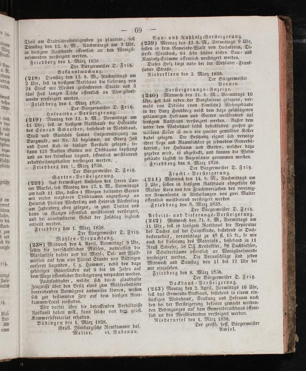 Friedberg den 1. Marz 1838. Der Bürgermeiſter D. Fritz. Mühlen- Verpachtung.