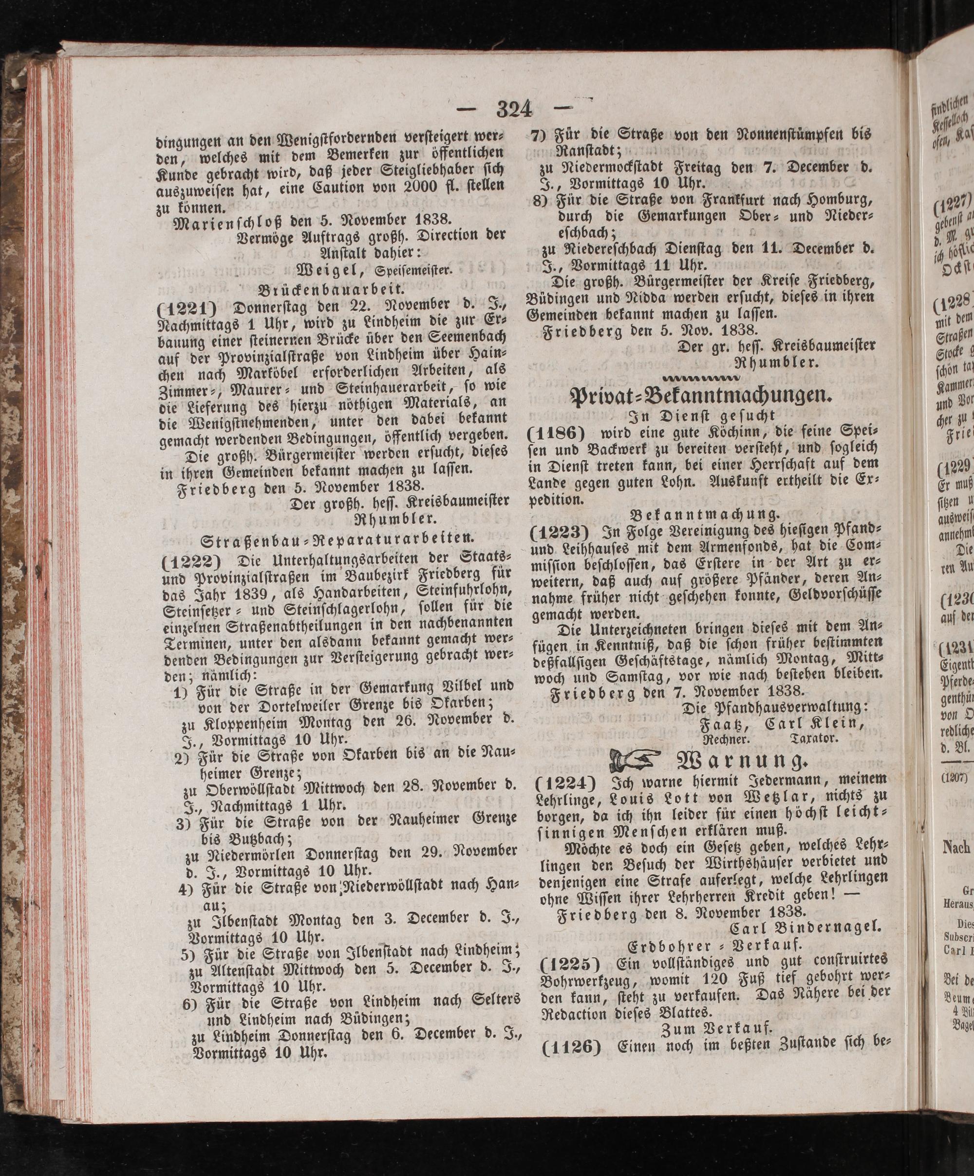 Der großh. heſſ. Kreisbaumeiſter Rhumbler. Straßenbau⸗Reparaturarbeſten. (1222) Die Unterhaltungsarbeiten der Staats⸗ und Provinzialſtraßen im Baubezirk Friedberg für das Jahr 1839, als Handarbeiten, Steinfuhrlohn, Steinſetzer⸗ und Steinſchlagerlohn, ſollen fuͤr die einzelnen Straßenabtheilungen in den nachbenannten Terminen, unter den alsdann bekannt gemacht wer⸗ denden Bedingungen zur Verſteigerung gebracht wer⸗