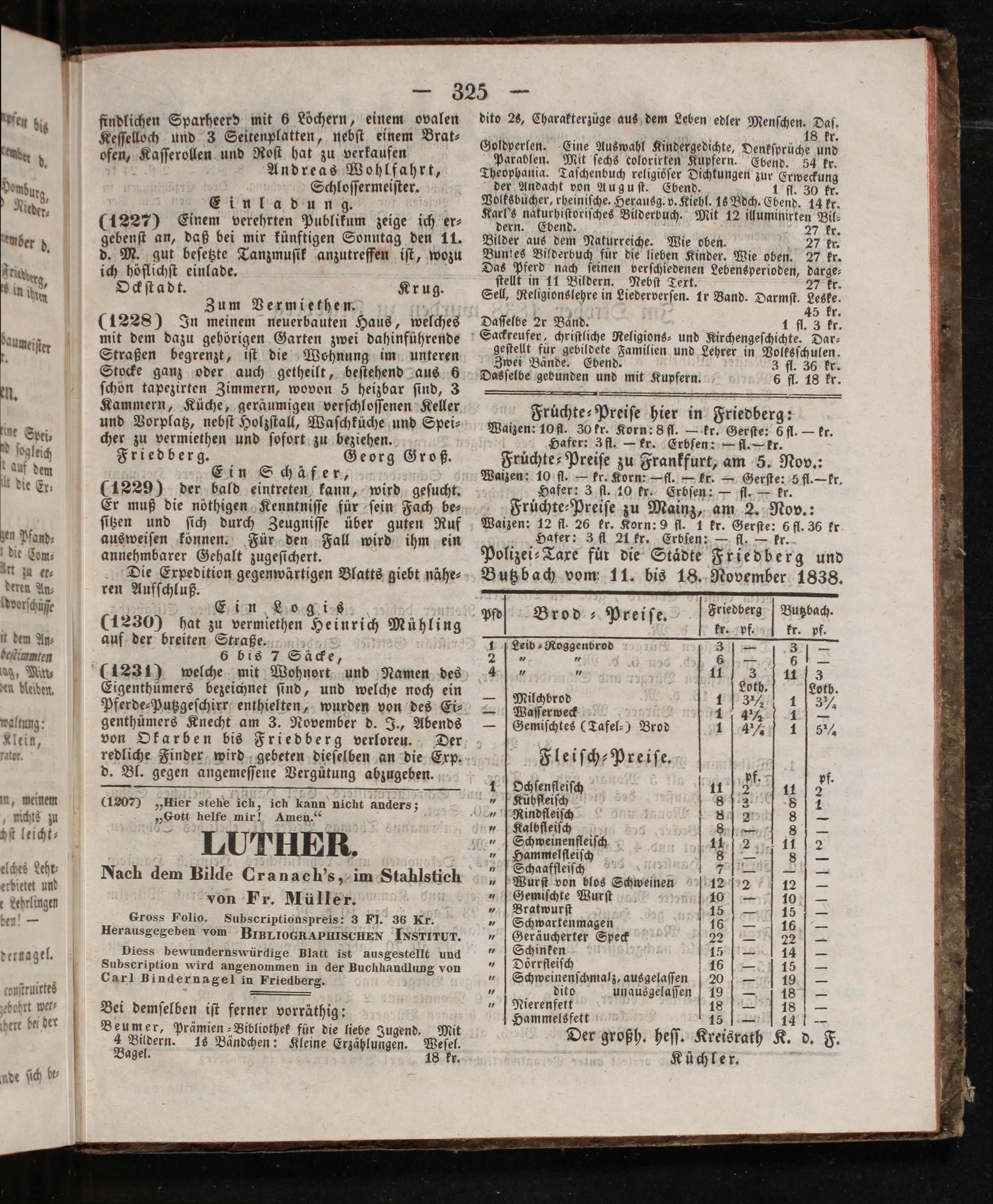Fruchte⸗Preiſe hier in Friedberg: Waizen: 10 fl. 30 kr. Korn: 8 fl.— kr. Gerſte: 6 fl.— kr. Hafer: 3 fl.— kr. Erbſen:— fl.— kr. Fruͤchte⸗Preiſe zu Frankfurt, am 5. Nov.: Waizen: 10 fl.— kr. Korn:— fl.— kr.— Gerſte: 5 fl.— kr. Hafer: 3 fl. 10 kr. Erbſen:— fl. kr. Fruͤchte⸗Preiſe zu Mainz, am 2. Nov.: Waizen: 12 fl. 26 kr. Korn: 9 fl. 1 kr. Gerſte: 6 fl. 36 kr Hafer: 3 fl 21 kr. Erbſen:— fl.— kr. Polizei⸗Taxe für die Staͤdte Friedberg und Butzbach vom 11. bis 18. November 1838.