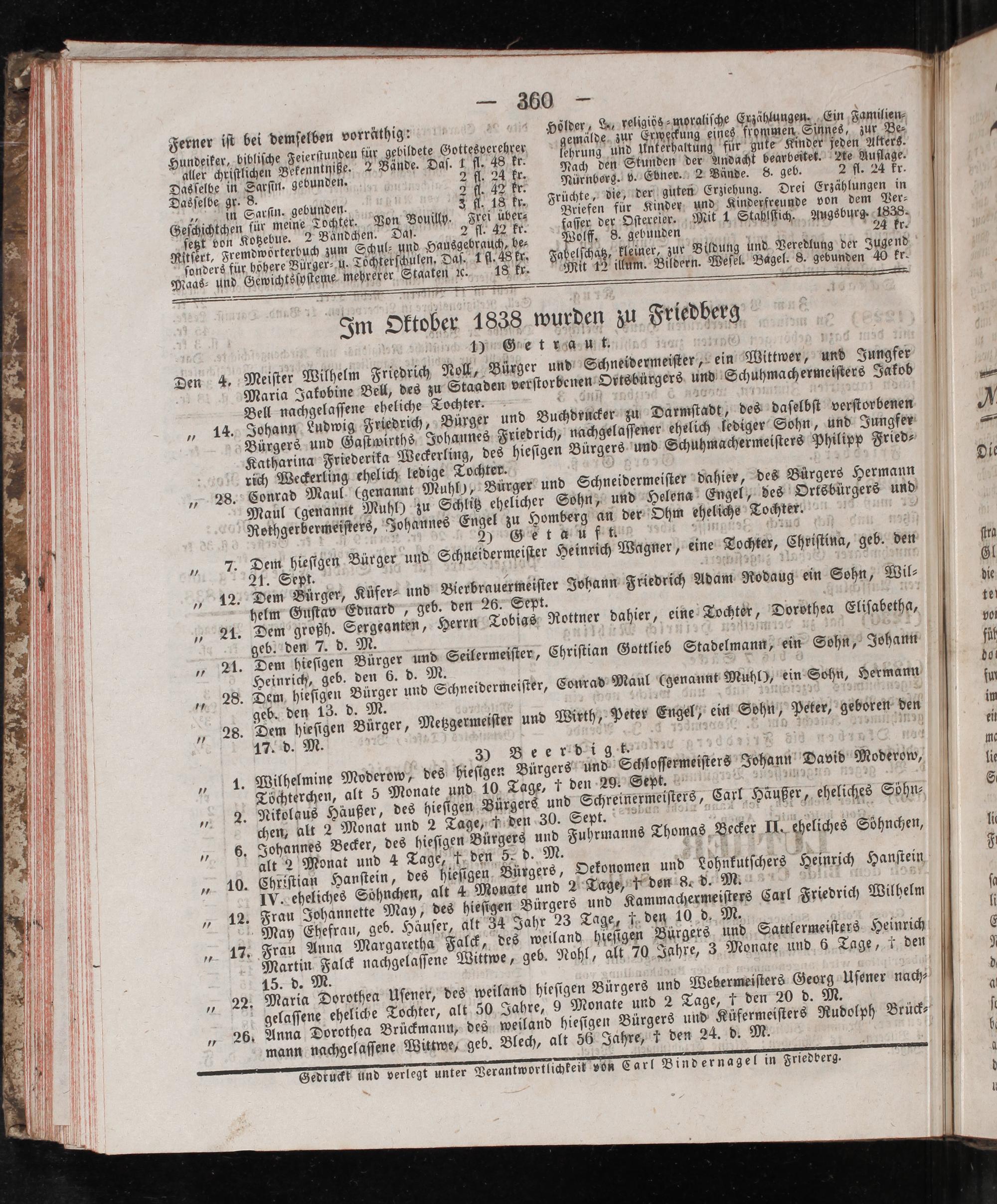 Den 4. Meiſter Wilhelm Friedrich Noll, Bürger und Schneidermeiſter, ein Mittwer, und Jungfer Maria Jakobine Bell, des zu Staaden verſtorbenen Ortsbürgers und Schuhmachermeiſters Jakob Bell nachgelaſſene eheliche Tochter. 8 1 10 f