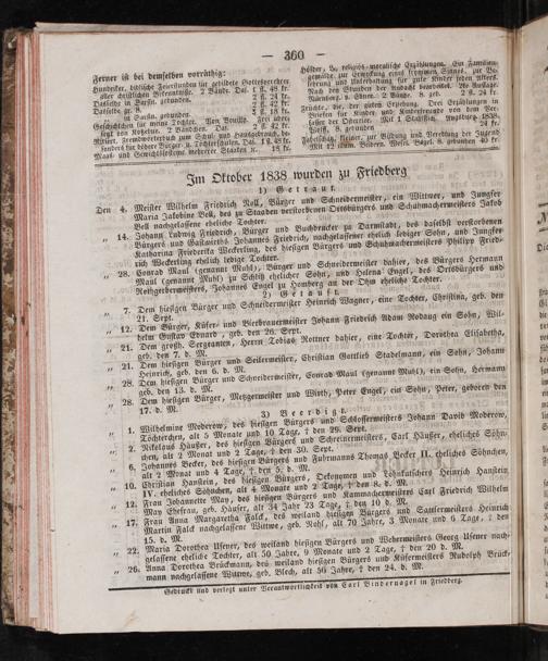 14. Johann Ludwig Friedrich, Bürger und Buchdrucker zu Darmſtadt, des daſelbſt verſtorbenen Bürgers und Gaſtwirths Johannes Friedrich, nachgelaſſener ehelich lediger Sohn, und Jungfer Katharina Friederika Weckerling, des hieſigen Bürgers und Schuhmachermeiſters Philipp Fried⸗