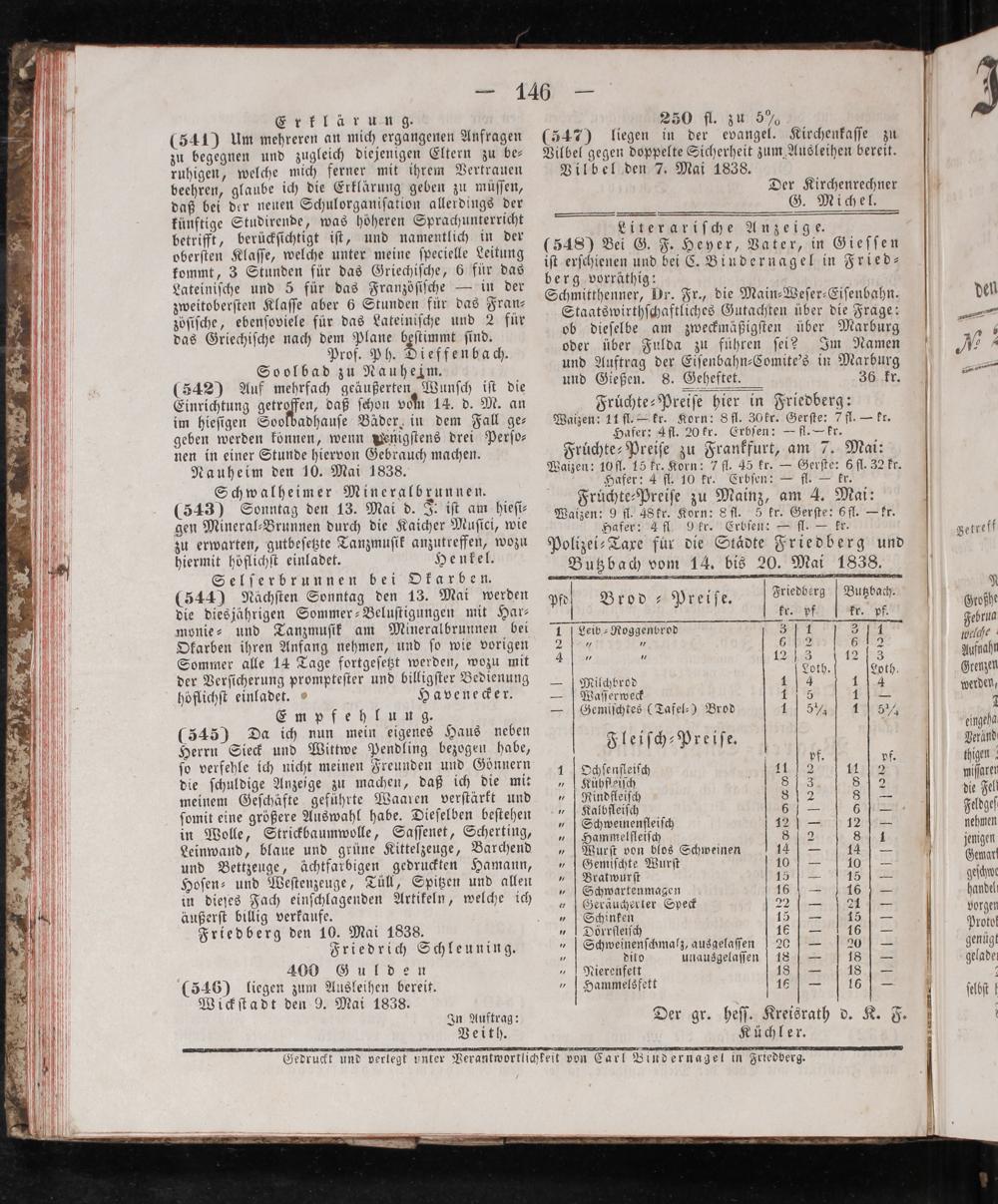 Hafer: 4 fl 9 kr. Erbſen:— fl.— kr. Polizei-Taxe für die Staͤdte Friedberg und Butzbach vom 14. bis 20. Mai 1838.