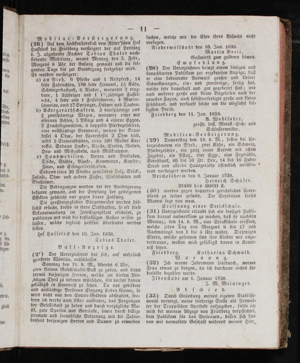 ſuchen, welche mir die Ehre ihres Beſuchs nicht verſagen. Niederwöllſtadt den 10. Jan. 1838. Martin Breit, Gaſtwirth zum goldnen Löwen. Empfehlung. (28) Der Unterzeichnete bringt einem hieſigen und benachbarten Publikum zur ergebenſten Anzeige, daß er eine bedeutende Auswahl großer und kleiner Schnellwaagen, ein- und zweiſeitige, fertig hat, welche ſehr dauerhaft und gut gearbeitet ſind; wie auch mehrere große und kleine Bügeleiſen nach der neueſten Facon, auch ſelbſtverfertigte große und kleine Fiſchband, und verkauft ſolche um die möglichſt bil— ligſten Preiſe. Friedberg den 11. Jan. 1838. A. Wohlfahrt, großh. heſſ. Metall-Eich⸗ und Schloſſermeiſter. Mobilien-Verſteigerung. (29) Donnerſtag den 18. d. M., ſollen bei Un⸗ terzeichnetem ein Pferd, zwei Kühe, ein Schwein, Pferdegeſchirr, ein ganz neuer Karren mit allem Zugehör, ein Pflug, eine Egge, eine Fegmühle, Strohbank, 40 bis 50 Ztr. Heu, 14 bis 16 Fuder Stroh und allerlei Hausgeräthe öffentlich meiſtbie- tend verſteigert werden. Reichelsheim den 9. Januar 1838. Heinrich Schäfer. 2000 bis 3000 fl. (30) werden gegen doppeltes gerichtliches Unter— pfand zu leihen geſucht. Die Expedition dieſes Blattes ſagt von wem. Eröffnung einer Strickſchule.