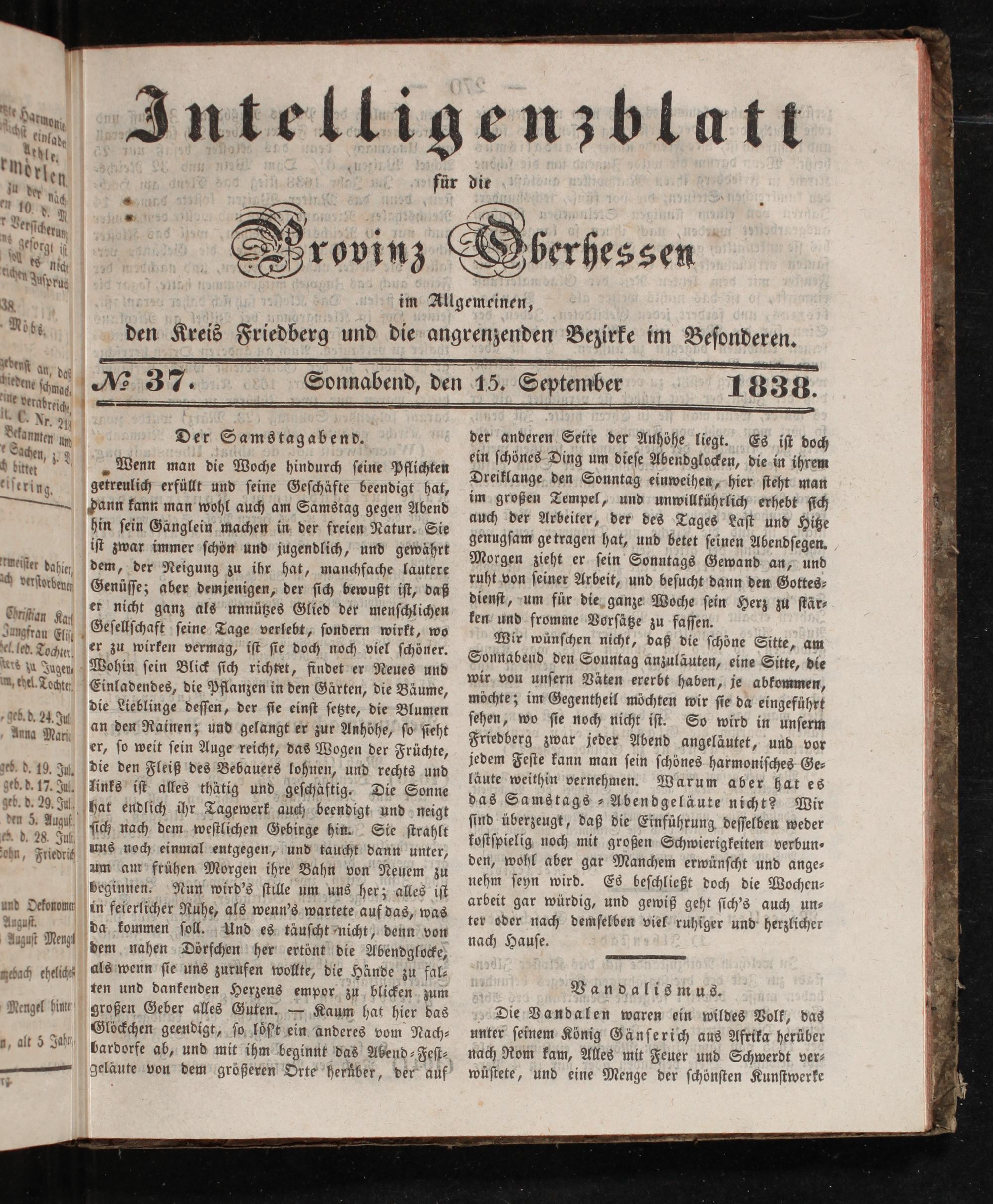Wir wünſchen nicht, daß die ſchöne Sitte, am Sonnabend den Sonntag anzuläuten, eine Sitte, die wir von unſern Väten ererbt haben, je abkommen, möchte; im Gegentheil möchten wir ſie da eingefuͤhrt ſehen, wo ſie noch nicht iſt. So wird in unſerm Friedberg zwar jeder Abend angeläutet, und vor jedem Feſte kann man ſein ſchönes harmoniſches Ge⸗ laute weithin vernehmen. Warum aber hat es das Samstags ⸗Abendgeläute nicht? Wir ſind überzeugt, daß die Einführung deſſelben weder koſtſpielig noch mit großen Schwierigkeiten verbun⸗ den, wohl aber gar Manchem erwünſcht und ange⸗ nehm ſeyn wird. Es beſchließt doch die Wochen— arbeit gar würdig, und gewiß geht ſich's auch un⸗ ter oder nach demſelben viel ruhiger und herzlicher nach Hauſe.