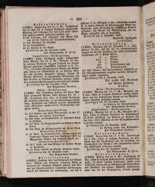auf dem Büreau des Unterzeichneten öffentlich an den Wenigſtnehmenden vergeben werden. Steiglieb⸗ haber werden eingeladen. Friedberg den 1. December 1838. g Der großh. heſſ. Kreisrath des Kreiſes Feiedberg Küchler. Korn ⸗Verſteigerung. (1333) Montag den 17. d. M., Morgens um 9 Uhr, ſollen in hieſigem Rathhaus fünfzig Achtel Korn aus der dießjährigen Aernte an die Meiſtbie⸗ tenden öffentlich verſteigert werden. 5 Friedberg den 13. December 1838. N In Auftrag der Armenkomiſſion: Der Beigeordnete Bender. Schubfuhren⸗Verſteigerung. (1334) Montag den 17. d. M., Morgens 10% Uhr, ſollen in hieſigem Rathhaus die Schubfuhren im Kreiſe Friedberg von Station zu Station für das Jahr 1839 öffentlich an den Wenigſtnehmenden verſteigert werden. i Friedberg den 10. December 1838. In Auftrag großh. heſf. Kreisraths: Der Beigeordnete Bender. Bekanntmachung.