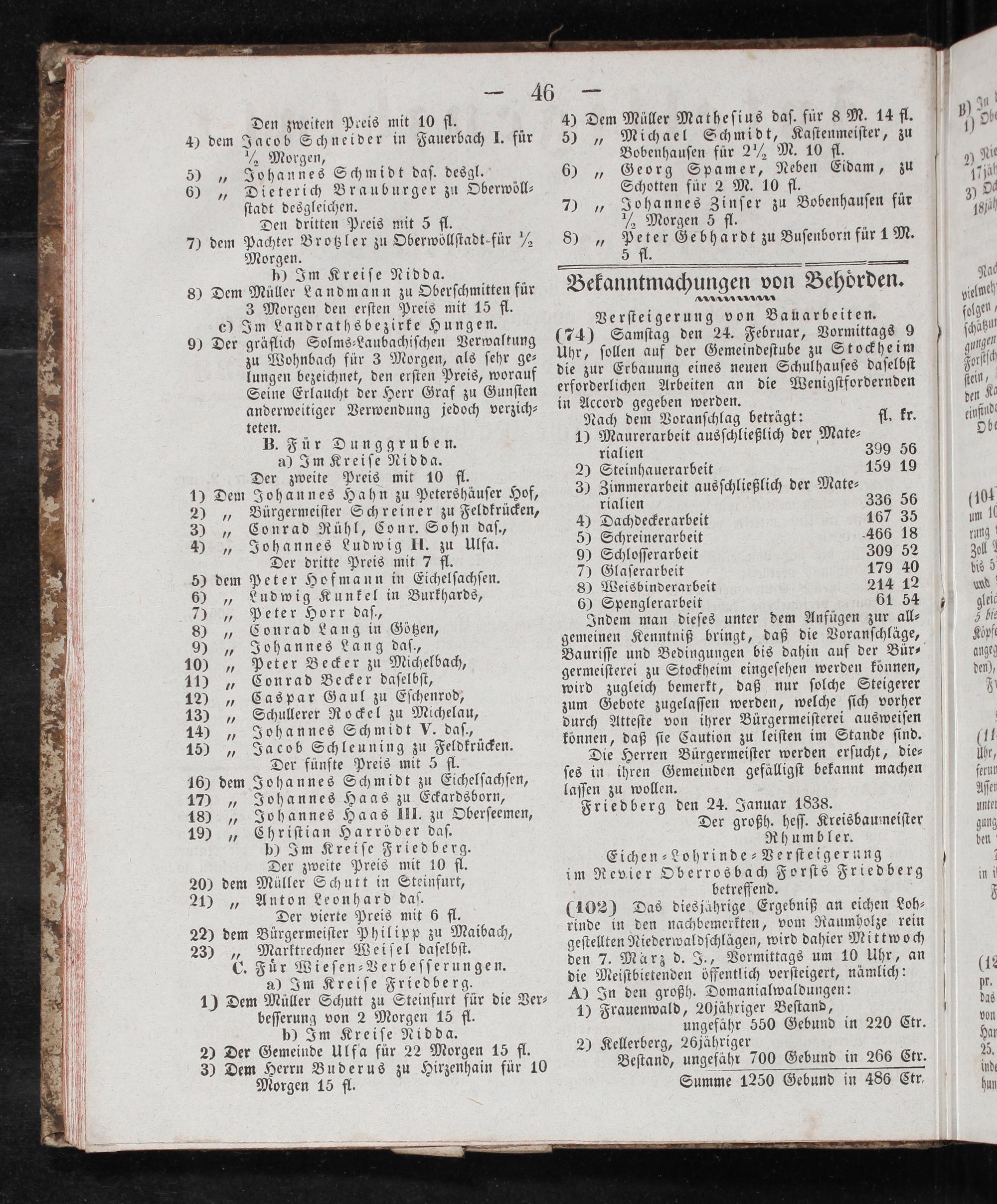 germeiſterei zu Stockheim eingeſehen werden können, wird zugleich bemerkt, daß nur ſolche Steigerer zum Gebote zugelaſſen werden, welche ſich vorher durch Atteſte von ihrer Bürgermeiſterei ausweiſen können, daß ſie Caution zu leiſten im Stande ſind. Die Herren Bürgermeiſter werden erſucht, die— ſes in ihren Gemeinden gefälligſt bekannt machen laſſen zu wollen. Friedberg den 24. Januar 1838. Der großh. heſſ. Kreisbaumeiſter Rhumbler. Eichen-Lohrinde-Verſteigerung im Revier Oberrosbach Forſts Friedberg a 5 betreffend. (102) Das diesjährige Ergebniß an eichen Loh⸗ rinde in den nachbemerkten, vom Raumholze rein geſtellten Niederwaldſchlägen, wird dahier Mittwoch den 7. Marz d. J., Vormittags um 10 Uhr, an die Meiſtbietenden öffentlich verſteigert, nämlich: A In den großh. Domanialwaldungen: 1) Frauenwald, 20jähriger Beſtand, ungefähr 550 Gebund in 220 Ctr. 2) Kellerberg, 26jähriger Beſtand, ungefahr 700 Gebund in 266 Ctr.