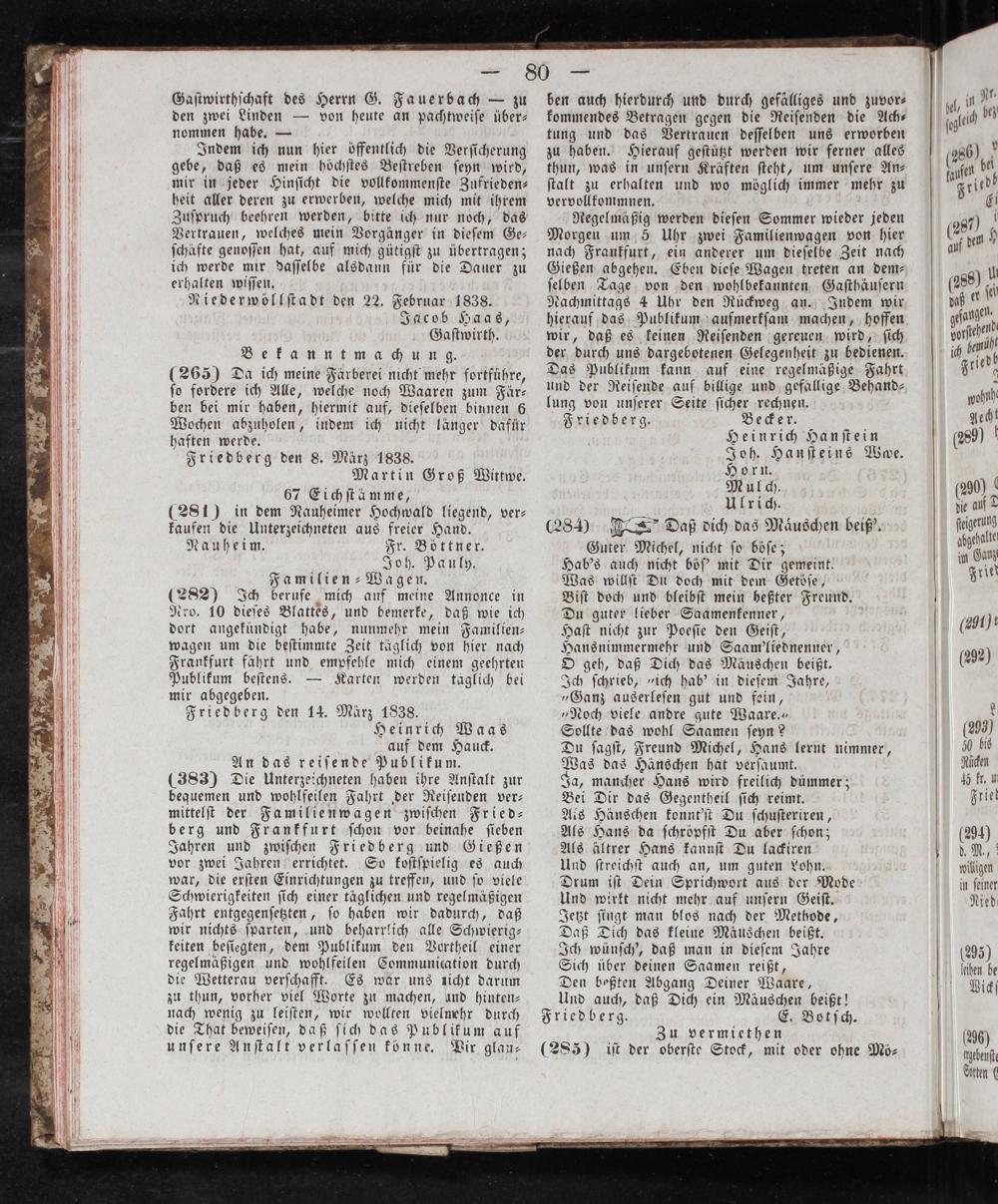 (282) Ich berufe mich auf meine Annonce in Nro. 10 dieſes Blattes, und bemerke, daß wie ich dort angekündigt habe, nunmehr mein Familien wagen um die beſtimmte Zeit täglich von hier nach Frankfurt fährt und empfehle mich einem geehrten Publikum beſtens.— Karten werden taglich bei mir abgegeben.