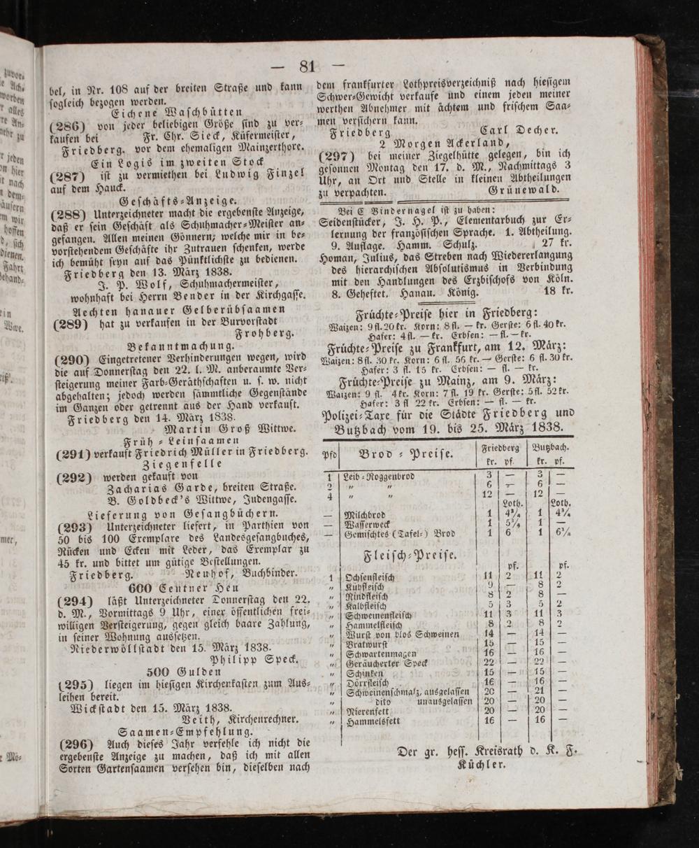 (289) hat zu verkaufen in der Burvorſtadt Frohberg. Bekanntmachung. (290) Eingetretener Verhinderungen wegen, wird die auf Donnerſtag den 22. l. M. anberaumte Ver⸗ ſteigerung meiner Farb⸗Geräthſchaften u. ſ. w. nicht abgehalten; jedoch werden ſämmtliche Gegenſtände im Ganzen oder getrennt aus der Hand verkauft. Friedberg den 14. März 1838. Martin Groß Wittwe. Früh ⸗Leinſaamen (291) verkauft Friedrich Müller in Friedberg. Ziegenfelle (292) werden gekauft von Zacharias Garde, breiten Straße. B. Goldbeck's Wittwe, Judengaſſe. Lieferung von Geſangbüchern. (293) Unterzeichneter liefert, in Parthien von 50 bis 100 Exemplare des Landesgeſangbuches, Rücken und Ecken mit Leder, das Exemplar zu 45 kr. und bittet um gütige Beſtellungen. Friedberg. Neuhof, Buchbinder. 600 Centner Heu (294) läßt Unterzeichneter Donnerſtag den 22. d. M., Vormittags 9 Uhr, einer öffentlichen frei⸗ willigen Verſteigerung, gegen gleich baare Zahlung, in ſeiner Wohnung ausſetzen. Niederwöllſtadt den 15. März 1838. Philipp Speck. 500 Gulden (295) liegen im hieſigen Kirchenkaſten zum Aus⸗ leihen bereit. Wickſtadt den 15. März 1838. Veith, Kirchenrechner. Saamen⸗ Empfehlung. (296) Auch dieſes Jahr verfehle ich nicht die ergebenſte Anzeige zu machen, daß ich mit allen Sorten Gartenſaamen verſehen bin, dieſelben nach