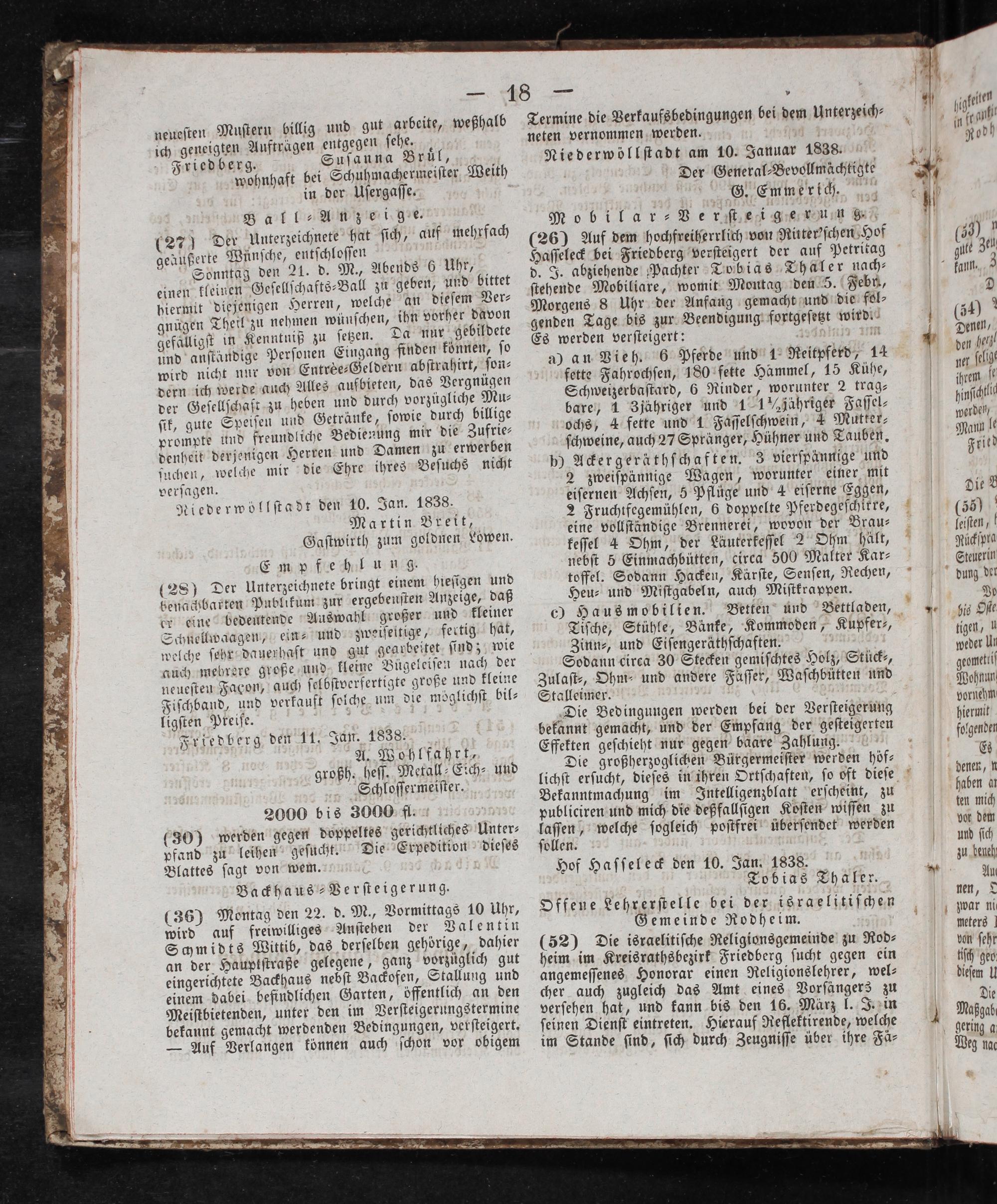 Bekanntmachung im Intelligenzblatt erſcheint, zu publiciren und mich die deßfallſigen Koſten wiſſen zu laſſen, welche ſogleich poſtfrei überſendet werden ſollen. Hof Haſſeleck den 10. Jan. 1838. Tobias Thaler.