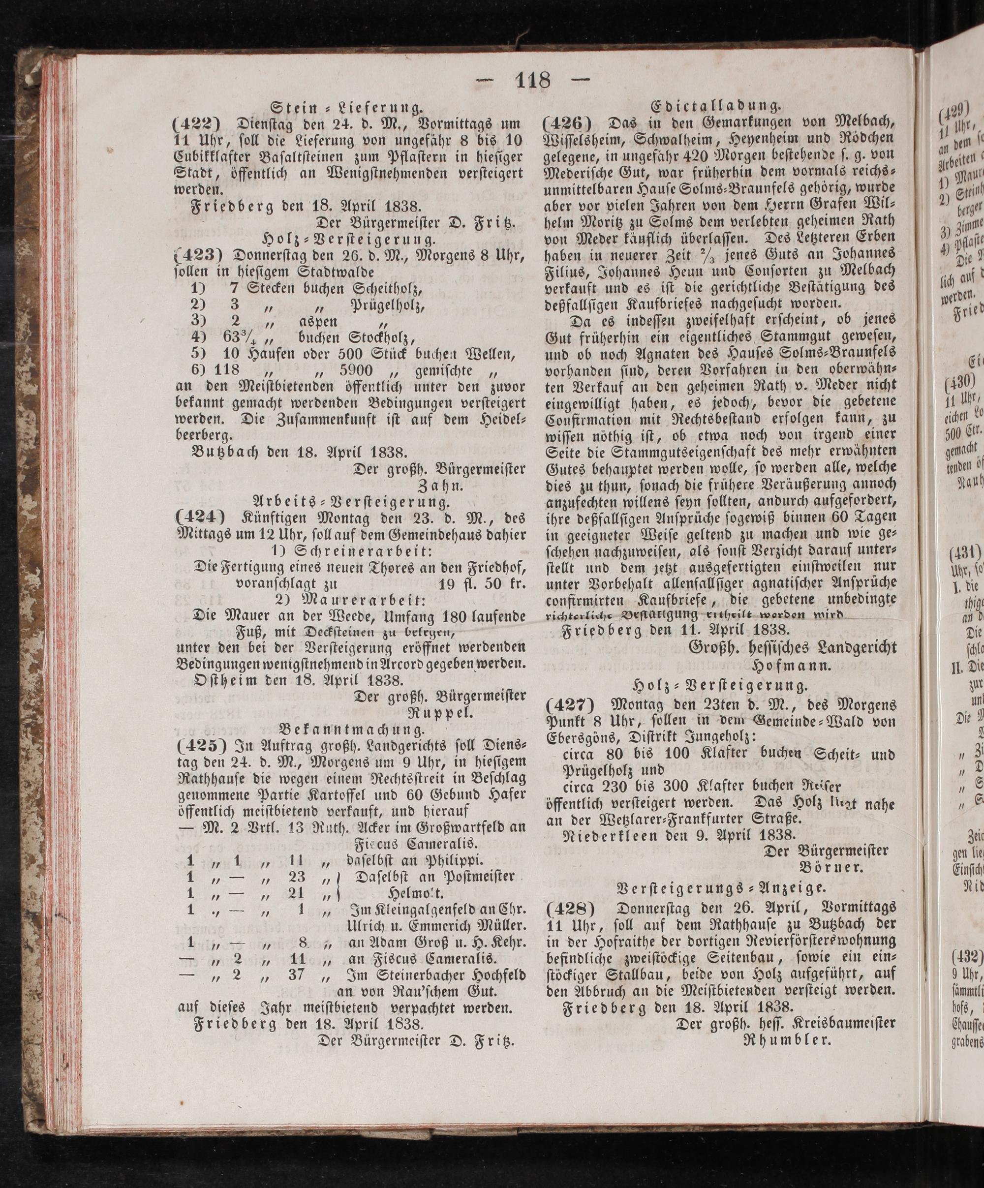 5) 10 Haufen oder 500 Stück buchen Wellen, 6) 118, ee, ehe, an den Meiſtbietenden öffentlich unter den zuvor bekannt gemacht werdenden Bedingungen verſteigert werden. Die Zuſammenkunft iſt auf dem Heidel- beerberg. Butzbach den 18. April 1838. Der großh. Buͤrgermeiſter Zahn. Arbeits-Verſteigerung. (424) Künftigen Montag den 23. d. M., des Mittags um 12 Uhr, ſoll auf dem Gemeindehaus dahier N 19 Schreinerarbeit: Die Fertigung eines neuen Thores an den Friedhof, voranſchlagt zu 19 fl. 50 kr. N 2) Maurerarbeit: Die Mauer an der Weede, Umfang 180 laufende Fuß, mit Deckſteinen zu belegen, unter den bei der Verſteigerung eröffnet werdenden Bedingungen wenigſtnehmend in Arcord gegeben werden. Oſtheim den 18. April 1838. Der großh. Bürgermeiſter Ruppel. Bekanntmachung. (425) In Auftrag großh. Landgerichts ſoll Diens⸗ tag den 24. d. M., Morgens um 9 Uhr, in hieſigem Rathhauſe die wegen einem Rechtsſtreit in Beſchlag genommene Partie Kartoffel und 60 Gebund Hafer öffentlich meiſtbietend verkauft, und hierauf — M. 2 Prtl. 13 Ruth. Acker im Großwartfeld an Fis cus Cameralis.