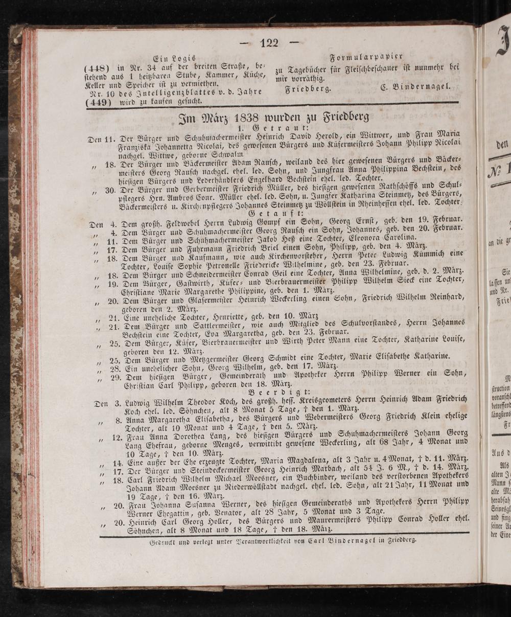 Im Maͤrz 1838 wurden zu Friedberg Get r aut: Den 11. Der Buͤrger und Schuhmachermeiſter Heinrich David Herold, ein Wittwer, und Frau Maria