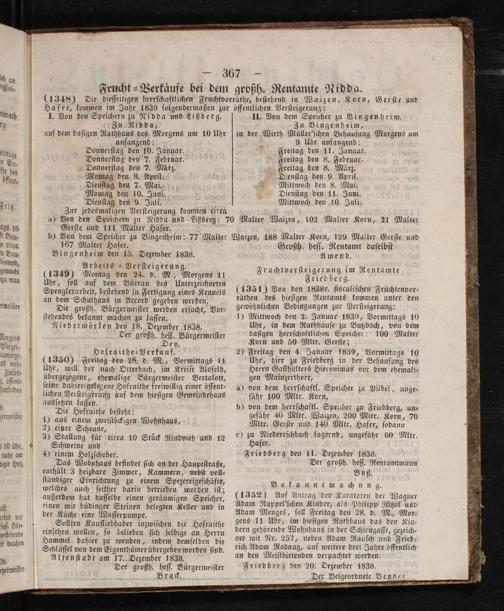 Frucht⸗Verkaͤufe bei dem großh. Rentamte Nidda. (1348) Die dieſſeitigen herrſchaftlichen Fruchtvorräthe, beſtehend in Walzen, Korn, Gerſte und Hafer, kommen im Jahr 1839 folgendermaßen zur öffentlichen Verſteigerung: