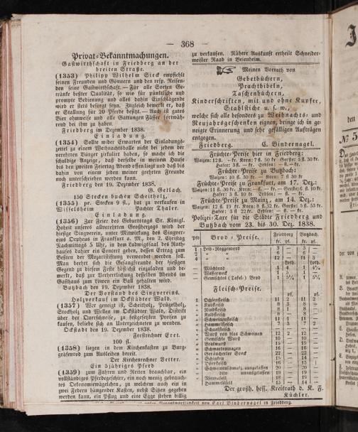 Waizen: 10 fl. 30 kr.— Korn: 7 fl 30 kr Früchte⸗Preiſe zu Frankfurt, am 17. Dez.: Waizen: 11 fl. 30 kr. Korn:— fl.— kr.— Gerſte: 6 fl. 10 kr. Hafer: 3 fl. 10 kr. Erbſen:— fl.— kr. Fruͤchte⸗Preiſe zu Mainz, am 14. Dez.: Waizen: 12 fl. 19 kr. Korn: 8 fl. 32 kr. Gerſte: 5 fl. 53 kr. Hafer: 3 fl 22 kr. Erbſen:— fl.— kr. Polizei-Taxe fuͤr die Städte Friedberg und Butzbach vom 23. bis 30. Dez. 1838.
