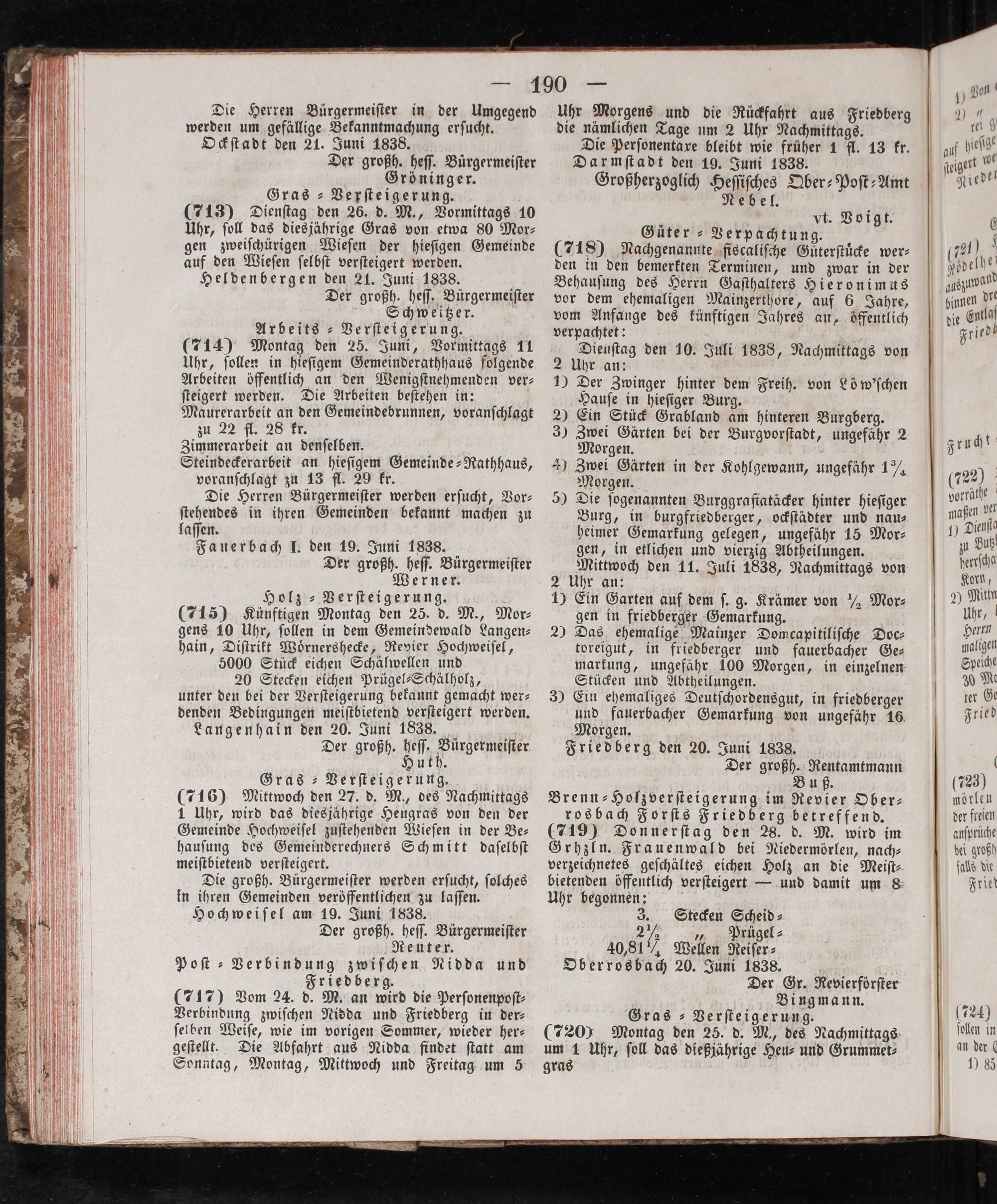 Gras-Verſteigerung. (716) Mittwoch den 27. d. M., des Nachmittags 1 Uhr, wird das diesjaͤhrige Heugras von den der Gemeinde Hochweiſel zuſtehenden Wieſen in der Be— hauſung des Gemeinderechners Schmitt daſelbſt meiſtbietend verſteigert. Die großh. Bürgermeiſter werden erſucht, ſolches in ihren Gemeinden veröffentlichen zu laſſen. Hochweiſel am 19. Juni 1838. Der großh. heſſ. Bürgermeiſter Reuter. Poſt⸗ Verbindung zwiſchen Nidda und Friedberg. (717) Vom 24. d. M. an wird die Perſonenpoſt⸗ Verbindung zwiſchen Nidda und Friedberg in der⸗ ſelben Weiſe, wie im vorigen Sommer, wieder her⸗ geſtellt. Die Abfahrt aus Nidda findet ſtatt am Sonntag, Montag, Mittwoch und Freitag um 5