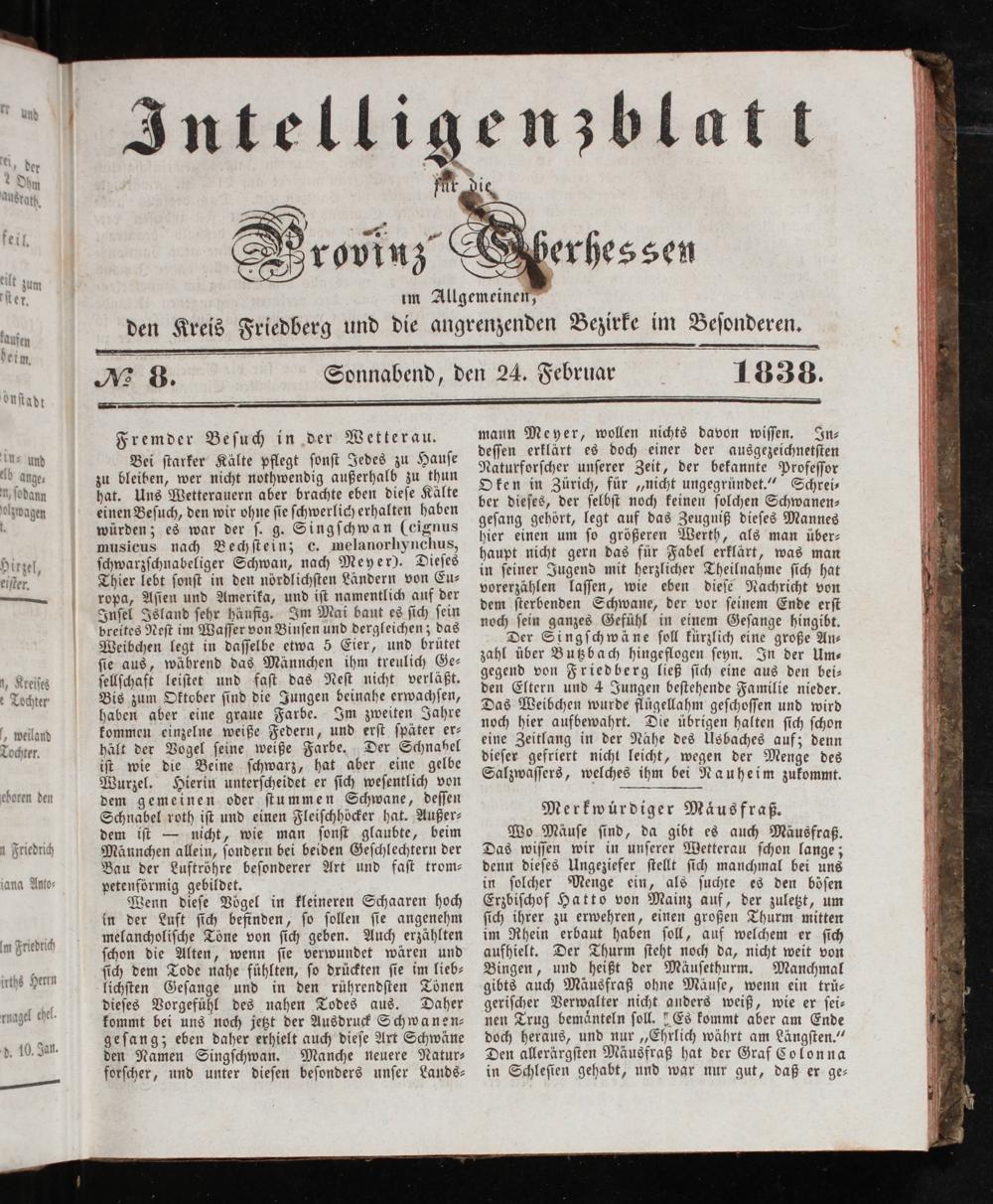 Der Singſchwäne ſoll kürzlich eine große An⸗ zahl über Butzbach hingeflogen ſeyn. In der Um— gegend von Friedberg ließ ſich eine aus den bei— den Eltern und 4 Jungen beſtehende Familie nieder. Das Weibchen wurde flügellahm geſchoſſen und wird noch hier aufbewahrt. Die übrigen halten ſich ſchon eine Zeitlang in der Nahe des Usbaches auf; denn dieſer gefriert nicht leicht, wegen der Menge des Salzwaſſers, welches ihm bei Nauheim zukommt.