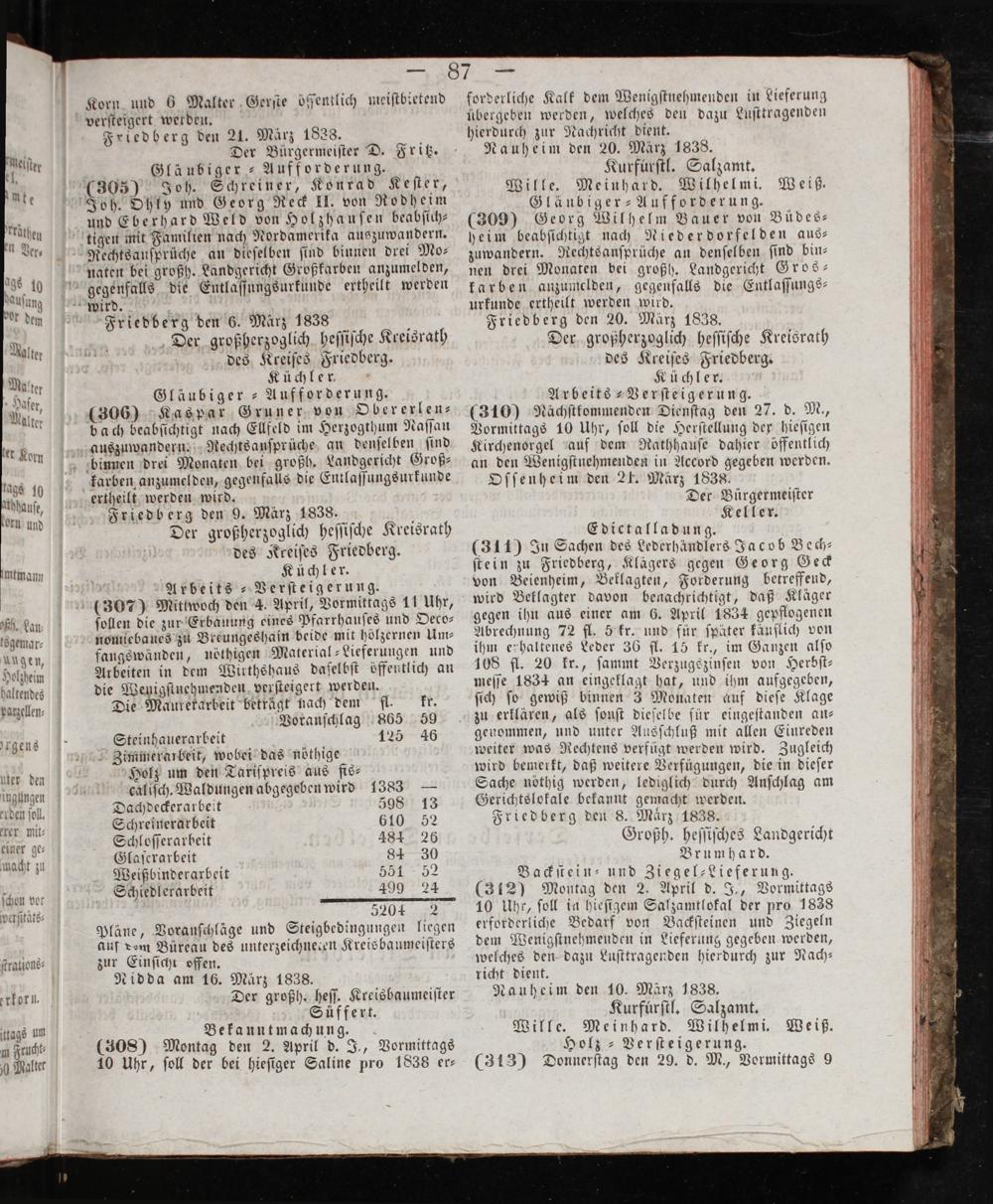 ertheilt werden wird. Friedberg den 9. März 1838. Der großherzoglich heſſiſche Kreisrath des Kreiſes Friedberg. Küchler. Arbeits-Verſteigerung. (307) Mittwoch den 4. April, Vormittags 11 Uhr, ſollen die zur Erbauung eines Pfarrhauſes und Oeco— nomiebaues zu Breungeshain beide mit hölzernen Um— fangswänden, nöthigen Material-Lieferungen und Arbeiten in dem Wirthshaus daſelbſt öffentlich an die Wenigſtnehmenden verſteigert werden. Die Maurekarbeit beträgt nach dem fl. kr. Voranſchlag 865 59 Steinhauerarbeit 125 46 Zimmerarbeit, wobei das nöthige Holz um den Tariſpreis aus fis⸗ caliſch. Waldungen abgegeben wird 1388—