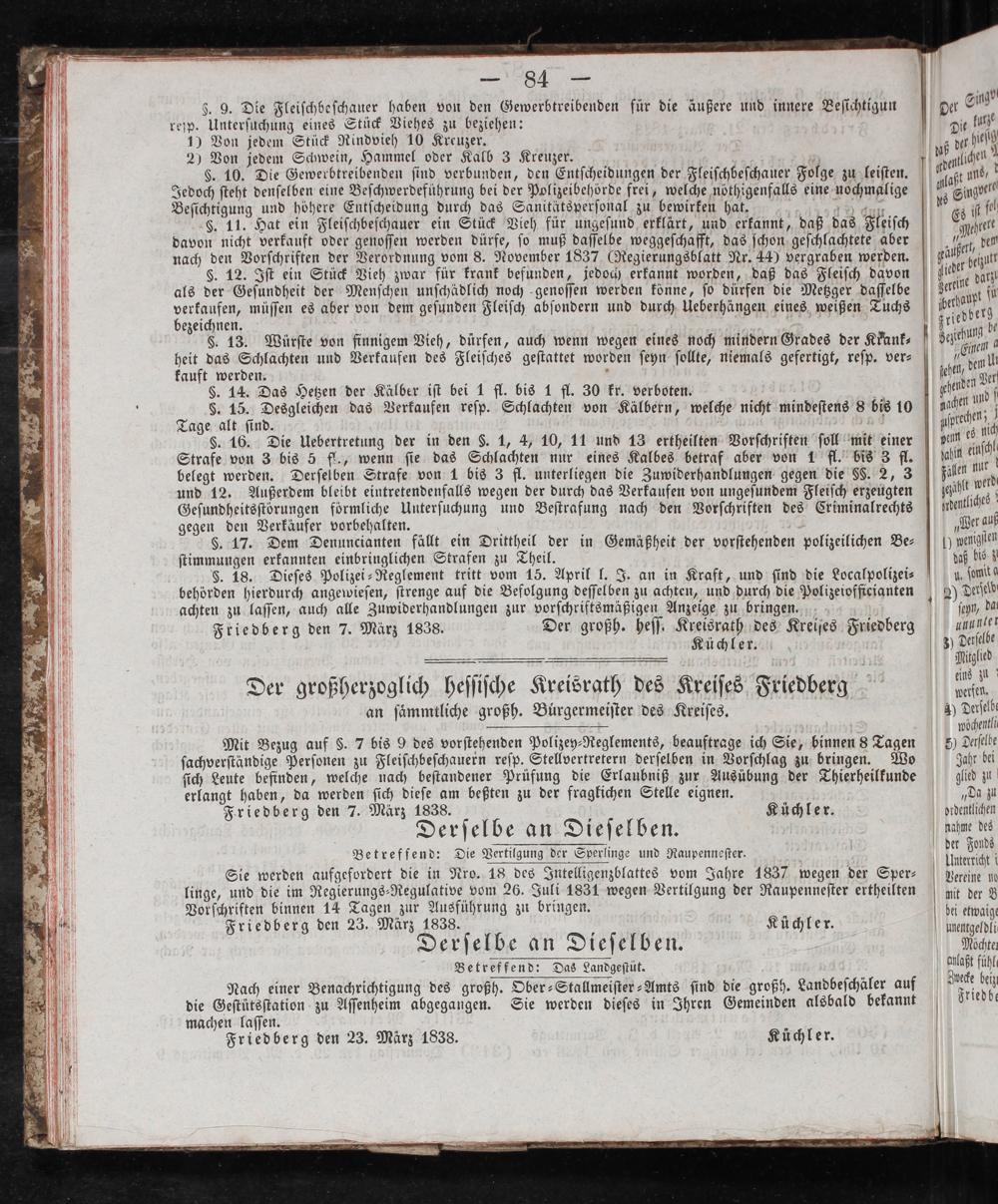 achten zu laſſen, auch alle Zuwiderhandlungen zur vorſchriftsmäßigen Anzeige zu bringen. Friedberg den 7. März 1838. Der großh. heſſ. Kreisrath des Kreiſes Friedberg Küchler.